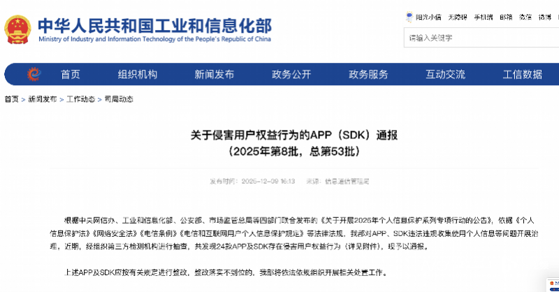记者12月9日从工业和信息化部获悉,依据相关法律法规,工业和信息化部对APP、SDK(第三方软件 开发工具包)违法违规收集使用个人信息等问题开展治理。近期,经组织第三方检测机构进行抽查,共 发现24款APP及SDK存在侵害用户权益行为。 据悉,上述APP及SDK应按有关规定进行整改,整改落实不到位的,工业和信息化部将依法依规组织开 展相关处置工作。(记者周圆) 记者12月9日从工业和信息化部获悉,依据相关法律法规,工业和信息化部对APP、SDK(第三方软件 开发工具包)违法违规收集使用个人信息等问题开展治理。近期,经组织第三方检测机构进行抽查,共 发现24款APP及SDK存在侵害用户权益行为。 据悉,上述APP及SDK应按有关规定进行整改,整改落实不到位的,工业和信息化部将依法依规组织开 展相关处置工作。(记者周圆) | 序号 | 应用名称 | 应用开发者 | 应用来源 | 应用版本 | 所涉问题 | | --- | --- | --- | --- | --- | --- | | 1 | 会计云课堂 | 天津东奥时代培 | 荣耀应用 | 4.1.4 | 未明示收集个人信息 清单 | | | | 训学校有限公司 ...
