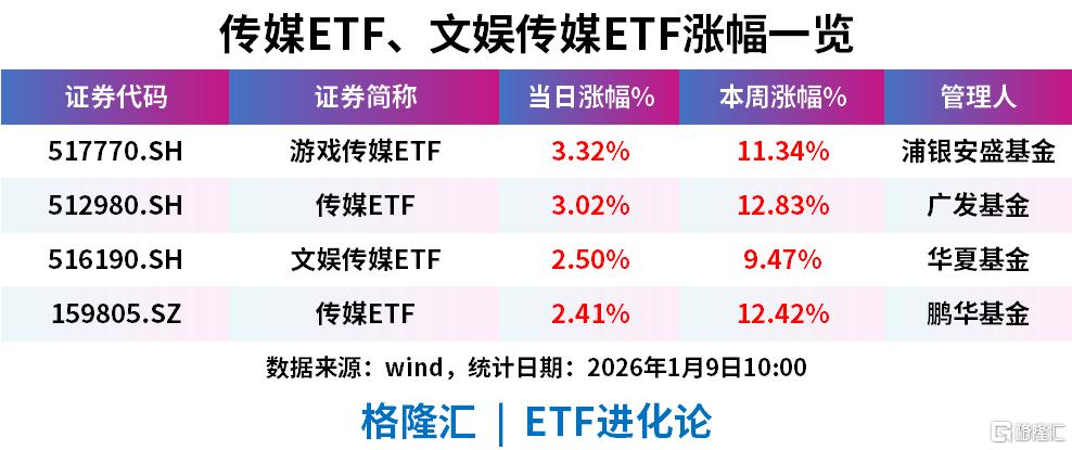 此外,AI搜索市场竞争格局正在发生重要变化。第三方机构Similarweb统计显示,2025年12月,谷歌Gemini日均网页访问量达到5600万次, 环比增长24%;ChatGPT访问量为1.78亿次,环比下降9%。 | 证券代码 | 证券简称 | 当日涨幅% | 本周涨幅% | 管理人 | | --- | --- | --- | --- | --- | | 517770.SH | 游戏传媒ETF | 3.32% | 11.34% | 浦银安盛基金 | | 512980.SH | 传媒ETF | 3.02% | 12.83% | 广发基金 | | 516190.SH | 文娱传媒ETF | 2.50% | 9.47% | 华夏基金 | | 159805.SZ | 传媒ETF | 2.41% | 12.42% | 鹏华基金 | 传媒ETF跟踪中证传媒,重仓股包括分众传媒、巨人网络、恺英网络、岩山科技、昆仑万维(维权)、利欧股份、三七互娱(维权)、光线 传媒、神州泰岳、芒果超媒。 消息面上,八部门联合印发《"人工智能+制造"专项行动实施意见》,从政策维度推动人工智能与制造业的深度融合,该政策落地有望催化 AI应 ...