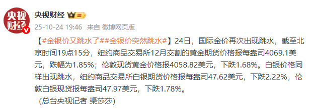 24日,国际金价再次出现跳水,截至北京时间19点15分,纽约商品交易所12月交割的黄金期货价格报每 盎司4069.1美元,跌幅为1.85%;伦敦现货黄金价格报4058.82美元,下跌1.68%。白银价格同样出现跳 水,纽约商品交易所白银期货价格报每盎司47.62美元,下跌2.22%,伦敦白银现货报每盎司47.97美 元,下跌1.78%。 (总台央视记者 渠莎莎) ...