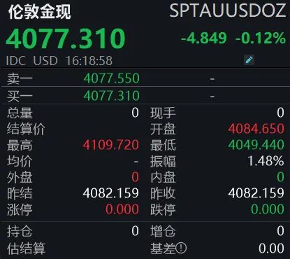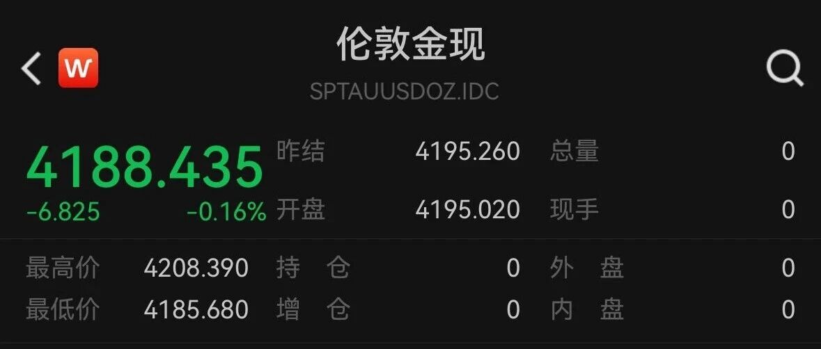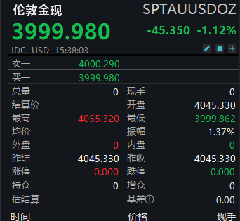 【大河财立方消息】11月18日,现货金价持续下跌。截至发稿,伦敦金现日内跌幅1.12%,报3999.98美 元/盎司,失守4000美元/盎司关口。 | 伦敦金现 | | | SPTAUUSDOZ | | --- | --- | --- | --- | | 3999.980 | | | -45.350 -1.12% | | IDC USD 15:38:03 | | | 1 . . + | | 定- | 4000.290 | | | | के | 3999.980 | | | | 总量 | 0 | 现手 | 0 | | 得意份 | | 开盘 | 4045.330 | | 量高 | 4055.320 | 最低 | 3999.862 | | 均价 | | 振幅 | 1.37% | | 外盘 | 0 | 内盘 | 0 | | 昨结 | 4045.330 | 肥收 | 4045.330 | | 涨信 | 0.000 | 跌停 | 0.000 | | 持仓 | 0 | 增仓 | 0 | | 保结算 | | 基差0 | 0.00 | | 时间 | | 价格 | 那手 | 最近4个交易日,伦敦金现连续下跌,累计跌幅达4.5%。 ...