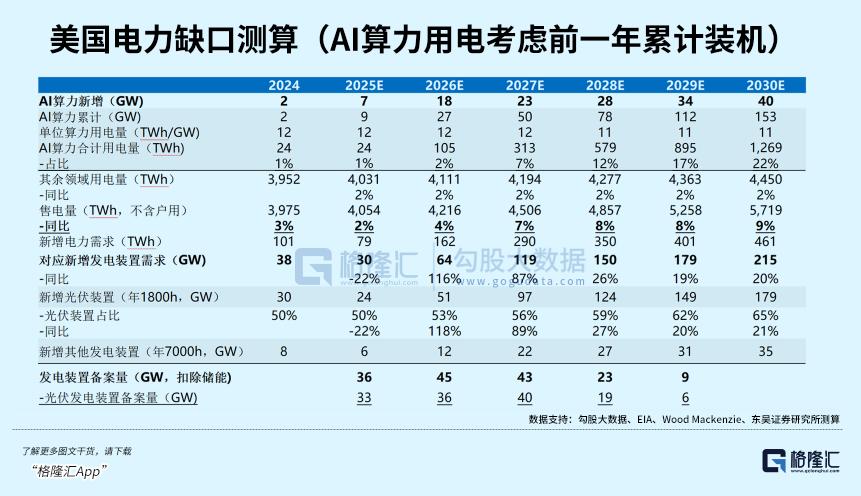 随着AI技术的飞速发展,美国数据中心的用电需求正呈爆炸式增长,电力短缺成为制约行业发展的核心瓶颈。与此同时, 全球"碳中和"浪潮下,绿电成为能源转型的必然选择。 在这两大趋势的叠加下,美国储能市场正迎来"量价齐升"的黄金发展期,绿电配储与AI储能双轮驱动,不仅将填补电力缺 口,更催生了千亿级市场机遇。 而中国在储能产业链上的优势地位,让国内相关企业有望深度受益于这波行业红利,作为A股市场投资者又该如何把握? AI数据中心"电荒"告急,电力缺口持续扩大 过去十年,美国年用电量基本稳定在4000TWh左右,复合增速仅2%。但AI数据中心的崛起彻底打破了这一平衡,算力扩张 带来的电力需求呈指数级增长。按照保守测算,到2030年,美国累计AI算力将达153GW,对应电力需求约1269TWh,占总 电力需求的22%。 然而,美国的电力供给却难以跟上需求增长的步伐。2025-2027年,美国新增发电装置备案年均约40GW(以光伏为主), 即便不考虑储能需求,年均仍存在20-40GW的电力缺口,且这一缺口还在持续扩大。 | | 2024 | 2025E | 2026E | 2027E | 2028E | 2029E | 2 ...