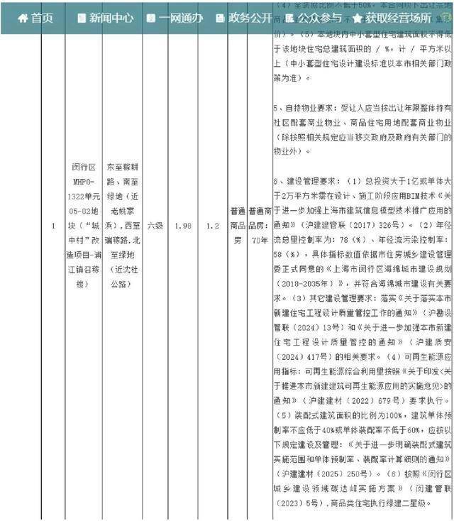 上海进深 张林霞 12月10日,上海市规划和自然资源局近期公示闵行区MHP0-1322单元05-02地块的协议 出让信息,该地块隶属于浦江镇召稼楼"城中村"改造项目。 | 伴 首页 | | | | ■ 新闻中心 ■ 一网通办 ■ 政务公开 ■ 公众参与 ★ 获取经营场所 ◎ | (1) 至高W元的中国TOOM 全国四川 中国四川省 | | --- | --- | --- | --- | --- | --- | | | | | | | THE OF ST AND FERE THE THE THE THE LE THE LET OF LIFE | | | | | | | 于该地块住宅总建筑面积的 / %+ 计 / 平方米以 | | | | | | | 上(中小意型住宅设计建设标准以本市相关部门政 | | | | | | | 美为准)。 | | | | | | | 5、自持物业要求:受让人应当按出让年限整体持有 | | | | | | | 社区配套商业物业、商品住宅用地面蓄商业物业 | | | | | | | (除按照相关规定应当移交政府及政府有关部门的 | | | | | | | 初止外)。 | | | 闵行区 ...