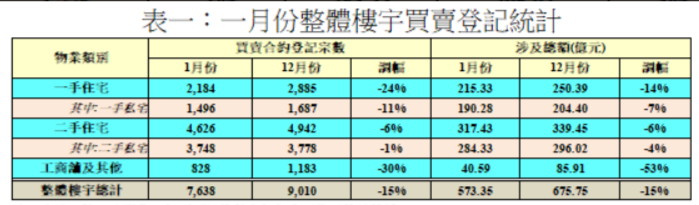 核心观点 - 研究部主管指出,尽管处于传统淡季,但一月份楼宇买卖登记量持续高企于7500宗以上,反映楼市旺势,预计后市经过短暂休整后将继续向好 [1] - 基于一月下旬新盘成交畅旺及二手市场买家大举入市,预计二月份整体楼宇买卖登记量将环比反弹逾16%,达到约8890宗,甚至可能再次冲击九千宗大关,实现农历新年前后的首波“小阳春” [6] 整体市场表现 - 2026年1月全港共录得7,638宗楼宇买卖登记,环比2025年12月的9,010宗回落15%,但仍是过去14个月以来的次高水平 [2] - 1月整体物业登记总值录得573.35亿港元,环比下跌15%,为近4个月低位 [2] 住宅市场表现 - 一手私宅买卖登记量连续第11个月稳定在千宗以上,1月录得1,496宗,环比下跌11%,为近11个月低位 [3] - 1月一手私宅买卖登记总值录得190.28亿港元,环比下跌7%,为近5个月最少 [3] - 1月登记量最多的三个新盘依次为柏景峰(156宗)、SIERRA SEA 2A期(90宗)及启德海湾1期(71宗) [3] - 居屋新盘观塘峻然贡献约526宗登记,拉动整体一手住宅登记量连续数月突破二千宗水平 [3] - 二手私宅市场交投持续强劲,连续10个月维持在逾三千伙水平,1月录得3,748宗登记,与上月3,778宗基本持平,为近21个月次高 [3] - 1月二手私宅登记总值录得284.33亿港元,环比微跌4%,同为近21个月次多 [3] 非住宅市场表现 - 1月整体工商铺及其他买卖登记量录得828宗,环比急跌30% [4] - 1月工商铺及其他买卖登记金额录得40.59亿港元,环比大幅下跌53%,主要因前月有两宗共计约三十亿港元的大额商厦登记推高了基数 [4] 市场驱动因素与前景 - 整体楼市气氛好转,经济及股市走好,加上楼价稳步上升,推动各类买家在年初及农历新年前加快入市步伐 [6] - 一月下旬新盘成交极为畅旺,相关登记将体现在二月数据中,加上二手市场买家大举入市,预计可抵消工商铺市场的弱势 [6]