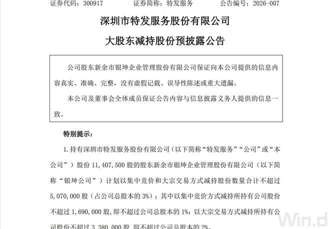 近日,深圳国资系上市公司特发服务(300917.SZ)发布大股东减持预披露公告,公司持股6.75%的股东 新余市银坤企业管理股份有限公司(下称"银坤公司"),计划以集中竞价和大宗交易方式合计减持不超 过507万股,占公司总股本的3%,减持期限为2026年2月13日至5月12日。 二股东半年内二次减持 特发服务披露,银坤公司本次拟减持的507万股中,集中竞价减持不超过169万股(占总股本1%),大 宗交易减持不超过338万股(占总股本2%),减持价格将根据二级市场实时价格确定,且不低于公司首 次公开发行股票发行价及最近一期经审计每股净资产,减持股份来源为公司首次公开发行前已发行的股 份,减持目的为股东自身资金规划。 从减持时间安排来看,本次减持需自公告披露之日起15个交易日后实施,避开了短线交易限制,同时严 格遵循A股减持新规要求,任意连续90日内集中竞价减持不超1%、大宗交易减持不超2%,减持期限设 定为3个月。 作为特发服务的重要股东,银坤公司的减持动作备受市场关注。公开资料显示,银坤公司自特发服务 2020年登陆创业板以来,为公司核心股东之一,其持股均为首发前股份,且已全部解除限售。 值得注意的是,这是银 ...