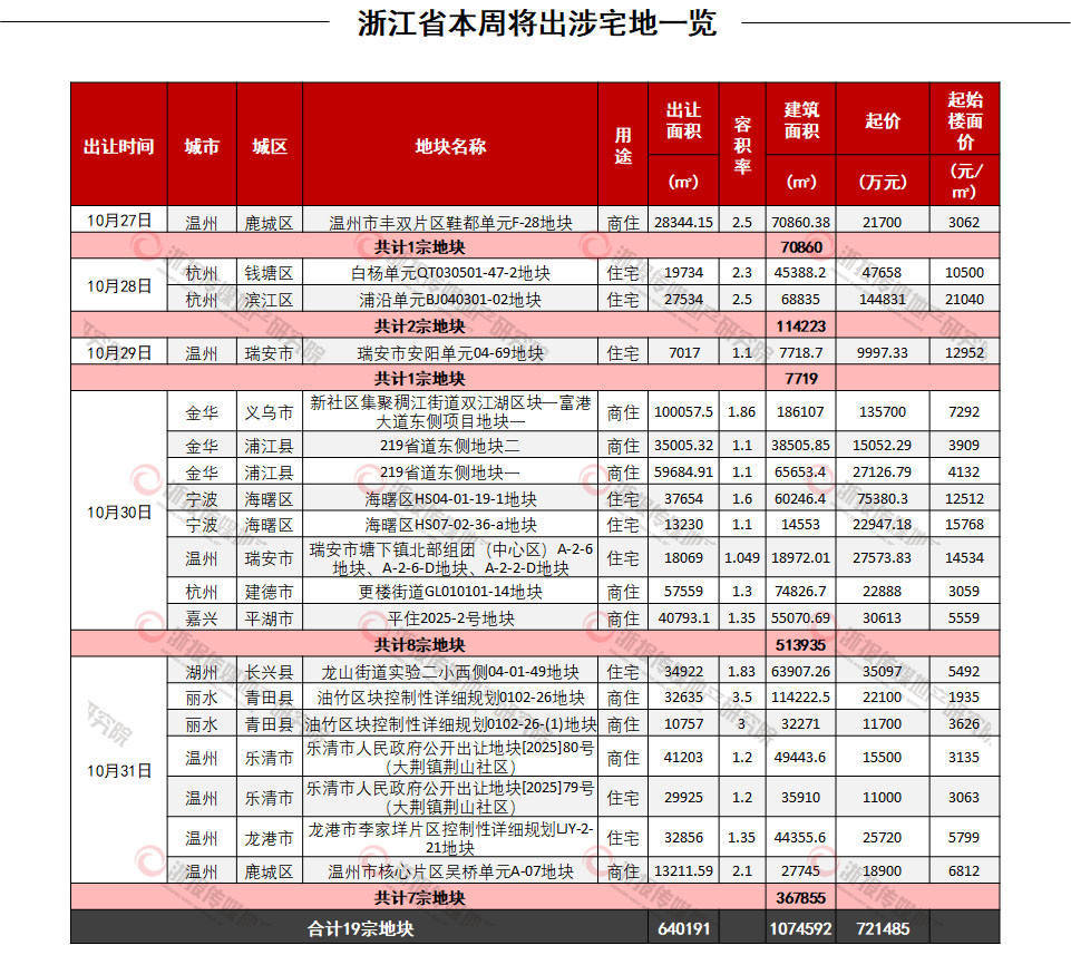 一周地产|月底全省19宗涉宅地密集出让,含两宗杭州地块