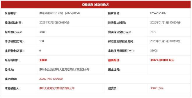 3.69亿元!惠州大亚湾3.7万平方米地块被国企摘牌