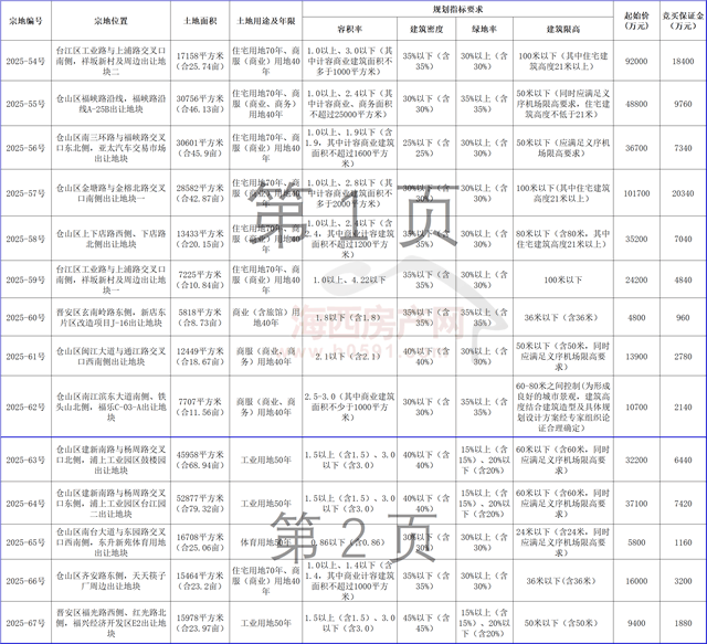 | 宗地编号 | 宗地位置 | 土地面积 | 土地用途及年限 | 规划指标要求 | | | | 起始价 | 竞买保证金 | | --- | --- | --- | --- | --- | --- | --- | --- | --- | --- | | | | | | 容积率 | 建筑密度 | 绿地率 | 建筑圆高 | (力元) | (力元) | | 2025-45号 | 酸棱区西 环路东侧,面四河南 | 33021平方案 | 住宅用地70年,商服 | 1.0以上、3.06以下(含 | 35%以下(含 | 30%以上(含 | 100米以下(其中住宅 | | | | | 侧,河南小柳源村出让烧块三 | (合49.53面) | (商业)用地40年 | 3.06. 其中计容商业建筑面 积不多于2500平方米) | 35%): | 30%) | 建筑高度21米以上) | 256200 | 51240 | | 2025-46号 | 仓山区复园路北侧、聚和路东侧 | 11522平方米 | 住宅用地70年、商服 | 1.0以上、1.1以下(含1.1. | 35%以下(含 | 30%以上(含 | | | 4720 | | | ...