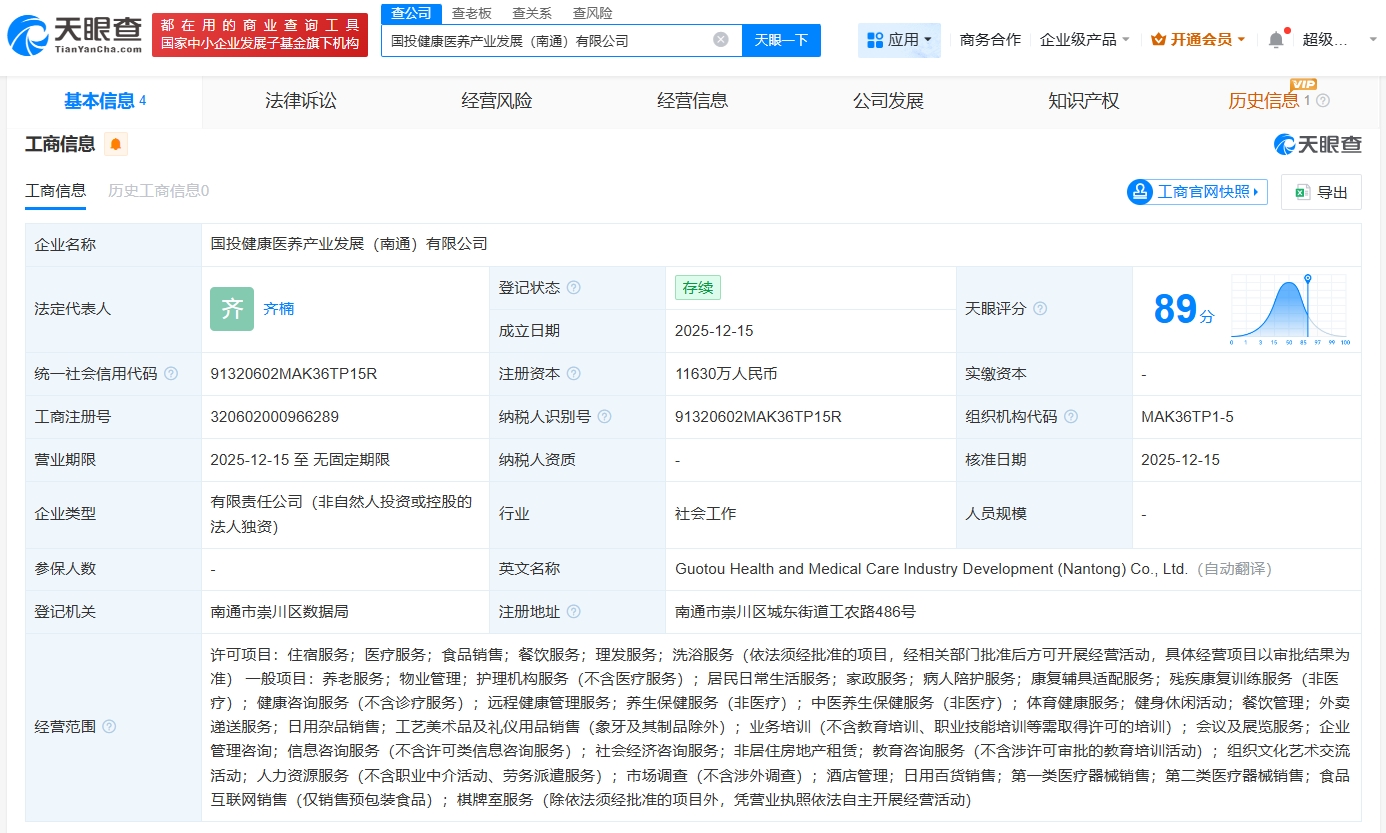 每经AI快讯,天眼查App显示,近日,国投健康医养产业发展(南通)有限公司成立,法定代表人为齐楠,注册资本约1.16亿元人民币,经营范围包括住宿服 务、医疗服务、食品销售、餐饮服务等。股东信息显示,该公司由国投健康产业投资有限公司全资持股。 | ● 大眼管 | 都在用的商业查询工具 | 更公司 查老板 查关系 查风险 | | | | | | --- | --- | --- | --- | --- | --- | --- | | 国家中小企业发展子基金旗下机构 | | 国投健康医养产业发展 (南通) 有限公司 | (×) | 天眼一下 | 品 应用 ▼ | 商务合作 | | 基本信息 4 | 法律诉讼 | 经营风险 | 经营信息 | | 公司发展 | 知识产 | | 股东信息 1 2 ● 品 股权结构 | | | | | | の持 | | 序号 | | 股东名称 | | | 持股比例 ÷ | 认缴出资额(万元) | | 國投 健康 | 国投健康产业投资有限公司 品 | | | | 100% | 116 | | | 查风险 查公司 查老板 查关系 都在用的商业查询工具 | | | --- | --- | --- ...