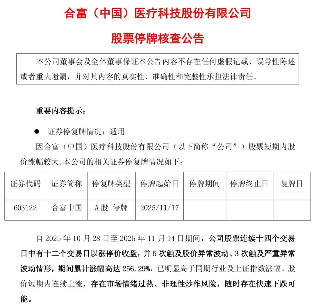 11月14日晚间,"14天12板"的大牛股合富中国(SH603122,股价23.8元,市值94.74亿元)公告称,公司股票连续14个交易日中有12个交易日以涨停价收 盘,并5次触及股价异常波动、3次触及严重异常波动情形,期间累计涨幅高达256.29%,已明显高于同期行业及沪指涨幅。 为维护广大投资者利益,根据相关规定,经向上交所申请,合富中国股票将于2025年11月17日(星期一)开市起停牌,预计停牌时间不超过3个交易日, 公司股票将自披露核查公告后复牌。公司提醒广大投资者注意二级市场交易风险。 | 证券代码 | 证券简称 | 停复牌类型 | 停牌起始日 | 停牌期间 | 停牌终止日 | 复牌日 | | --- | --- | --- | --- | --- | --- | --- | | 603122 | 合富中国 | A 股 停牌 | 2025/11/17 | | | | 而在上述异动期间,合富中国已于10月30日、10月31日、11月1日、11月4日、11月5日、11月6日、11月7日、11月8日、11月12日、11月13日和11月14日披 露了多份有关公司股票交易异常波动、严重异常波动及风险提示的公告 ...
