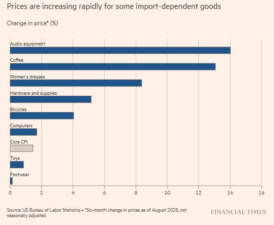 英国《金融时报》10月5日刊文指出,尽管美国整体通胀率温和上升,但特朗普政府的关税政策正开始 推高美国消费品价格,从罐头到汽车零部件,不一而足。 文章援引华尔街某研究公司追踪的进口商品数据报道称,自4月以来,29种"软线产品"中有11种(如T恤 和鞋子)、18种"硬线产品"中有12种(如自行车和洗碗机)、16种体育用品中有5种都被零售商上调了 价格。"这表明关税正在产生影响,并导致价格上涨。" 文章还称,全球最大的家具制造商阿什利家具的大部分产品自10月5日起涨价3.5%至12%。该公司首席 执行官托德·瓦内克就直言,"持续的关税形势给整个行业带来了巨大的成本挑战"。汽车零部件零售商 AutoZone首席执行官菲利普·丹尼尔也表示,随着关税影响的全面显现,"涨价幅度可能会更大"。美国 供应管理协会近期发布的调查显示,食品服务、建筑和公用事业等行业均对关税的影响表示担忧。 《金融时报》报道截图 《金融时报》报道标题 报道称,官方数据和企业声明显示,在企业清空库存并将关税成本转嫁给消费者后,一系列依赖贸易的 商品价格出现加速上涨。报道援引美国劳工统计局的数据指出,在截至8月的六个月时间内,音响设备 价格上涨14% ...