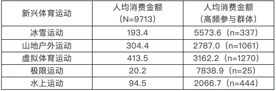 二、 上海体育消费主要特点 (一)新兴体育运动消费潜力大 随着消费理念从单纯的产品消费逐渐转向追求体验消费,社交化、娱乐化、个性化日渐成为大众参与体育运动的驱动力。近年来,露营、登山、徒步、骑 行、桨板、滑雪等户外运动相继成为运动时尚,飞盘、腰旗橄榄球、匹克球、虚拟运动等参与门槛较高、社交属性较强的新兴运动项目加速"出圈",在上 海得到迅速推广,带动体育消费呈现内容个性化、功能社交化和产品新潮化等特点。 根据上海体育市场、政策导向,本报告对冰雪运动、山地户外运动、虚拟运动、极限运动、水上运动5类新兴体育项目进行居民体育消费情况调查。数据 显示,2023 年有近三成的上海市居民参与过新兴运动,且消费呈现出多元化和大众化共同发展的格局,市场潜力大。其中,虚拟体育运动和山地户外运 动具有广泛的群众基础,高频参与人数众多,且人均消费水平较为适中,贴近大众消费能力。相对而言,极限运动和冰雪运动具有专业化和高消费的特 征,高频参与人数较少,但是人均消费水平显著偏高,尤其是极限运动,仅有25人高频参与,其人均消费金额高达7837.9元。可以看出,新兴体育运动人 均消费金额受项目本身性质影响,群体参与及消费支出存在明显分化。 ...