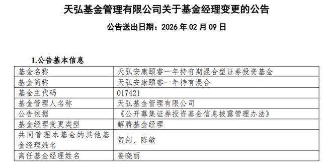 基金经理人事变动 - 天弘基金基金经理姜晓丽因个人原因离职,自2月9日起卸任其管理的全部公募基金产品 [2] - 姜晓丽离职主要源于希望阶段性休整并更多兼顾家庭,其自2009年工作后从未休过长假 [5] - 姜晓丽卸任的10只产品在2025年末总规模约为350.24亿元,在其任内均实现正向收益 [6] 基金经理背景与历史业绩 - 姜晓丽于2009年加入天弘基金,曾任固定收益研究员、基金经理助理、固定收益业务总监兼宏观研究部及固定收益部总经理等职 [6] - 在2021年末至2022年上半年期间,姜晓丽的管理规模曾超过700亿元 [6] - 姜晓丽为经济学硕士,拥有债券研究员与交易员背景,曾任职于天弘基金和光大永明人寿 [6] 产品接任安排与公司业务模式 - 天弘基金表示其“固收+”业务采用多基金经理共管模式,接任者将继续执行既定投资目标与流程,投资范围无重大变化 [5][6] - 姜晓丽卸任产品的接任者为共事多年、经验丰富的基金经理,例如天弘永利债券已增聘知名基金经理杜广共同管理 [5][6] - 天弘基金业务范围涵盖二级市场股票投资、债券投资、现金管理、衍生品投资及股权、债权等投资 [6] 公司概况与规模数据 - 天弘基金成立于2004年,是经中国证监会批准设立的全国性公募基金管理公司,也是余额宝的基金管理人 [6] - 截至2025年末,天弘基金公募管理总规模升至1.25万亿元,非货管理规模为4265.26亿元 [6] - 天弘基金的非货管理规模在两年间增长超过42% [6]