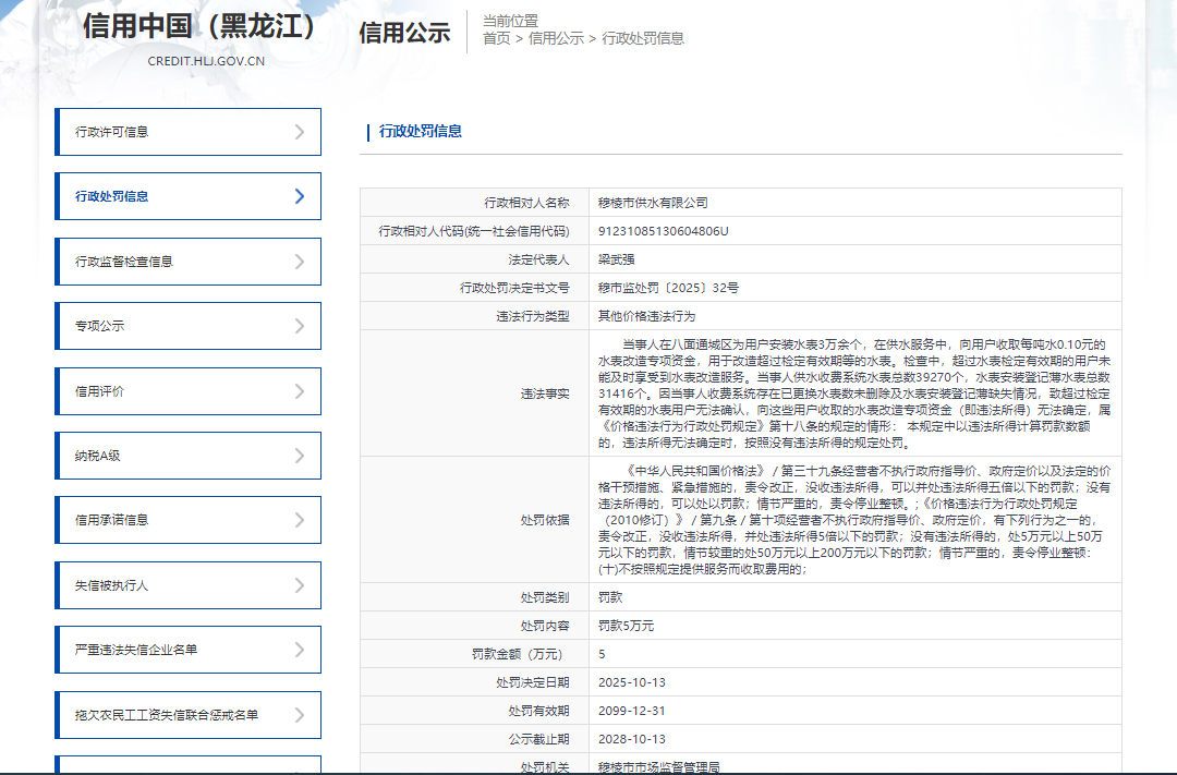 行政处罚事件概述 - 穆棱市供水有限公司因价格违法行为被穆棱市市场监督管理局处以5万元罚款 [1] - 处罚决定日期为2025年10月13日,公示截止期为2028年10月13日 [1] - 行政处罚决定文号为穆市监处罚〔2025〕32号 [1] 价格违法行为详情 - 公司在供水服务中向用户收取每吨水0.10元的水表改造专项资金 [1] - 专项资金用于改造超过检定有效期等的水表,但超过有效期的用户未能及时享受改造服务 [1] - 公司安装水表3万余个,但供水收费系统显示水表总数为39270个,而水表安装登记薄上总数仅为31416个 [1] - 由于收费系统中存在已更换水表未删除及登记簿缺失的情况,无法确认超过检定有效期的水表用户和收取的专项资金具体金额 [1] 法律依据与处罚 - 依据《中华人民共和国价格法》第三十九条及《价格违法行为行政处罚规定(2010修订)》第九条第十项的规定进行处罚 [1] - 根据《价格违法行为行政处罚规定》第十八条,因违法所得无法确定,按照没有违法所得的情形处以5万元罚款 [1] 公司基本信息 - 穆棱市供水有限公司成立于1989年8月14日,法定代表人为梁武强 [1] - 公司注册资本为407万元,所属行业为水的生产和供应业 [1] - 企业注册地址位于黑龙江省牡丹江市穆棱市八面通镇城西委 [1]