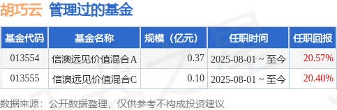 | 基金代码 | 基金名称 | 规模(亿元) | 任职时间 | 任职回报 | | --- | --- | --- | --- | --- | | 013554 | 信澳远见价值混合 A | 0.37 2025-08-01 ~ 至今 | | 20.57% | | 013555 | 信澳远见价值混合C | 0.10 2025-08-01 ~ 至今 | | 20.40% | 以上内容为证券之星据公开信息整理,由AI算法生成(网信算备310104345710301240019号),不构成 投资建议。 证券之星消息,2025年10月16日,信澳红利智选混合(020657)发布公告,增聘胡巧云为基金经理,任 职日期自2025年10月16日起,变更后信澳红利智选混合(020657)的基金经理为林景艺,胡巧云。截止 2025年10月15日,信澳红利智选混合净值为1.0695,较上一日上涨0.63%,近一年上涨8.82%。 胡巧云女士:厦门大学保险学硕士。2018年7月至2025年5月于上海申银万国证券研究所有限公司财富管 理研究部任分析师,2025年5月加入信达澳亚基金管理有限公司。2025年8月1日起任信澳远见价值混合 型 ...