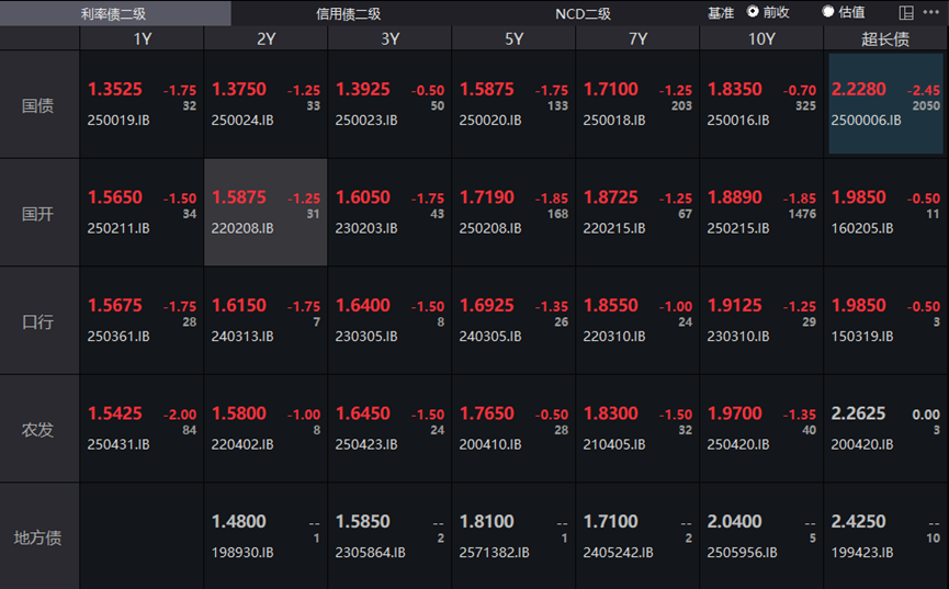 智通财经12月19日讯(编辑 李响)今日,股债双市齐涨,国债期货先是震荡,尾盘快速拉升上涨,技术指标进一步修复。 业内人士指出,经过连续几日的修复,30-10的国债利差已从前期高点逐步收敛,考虑到明年超长债供给强度并不会明显下 降、机构的承接能力、当前已经隐含的定价,10年期国债收益率与30年期国债收益率的利差仍有小幅上升的空间,但进一 步上行的空间可能相对有限。 具体来看,国债期货收盘全线上涨,30年期主力合约涨0.22%报112.660元,10年期主力合约涨0.10%报108.150元,5年期主 力合约涨0.09%报105.970元,2年期主力合约涨0.04%报102.490元。 银行间主要利率债收益率全线下行,截至下午16:30,10年期国债活跃券250016收益率下行0.7bp报1.835%,30年期国债活 跃券2500006收益率下行2.45bp报2.228%,10年期国开活跃券250215收益率下行1.85bp报1.889%。 | | 利率债二级 信用债二级 幕准 ◎ 前收 | | | | NCD二级 NCD二级 | | | ● 估值 ··· | | | --- | --- | --- | --- ...