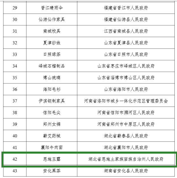 | 29 | 各江喷向伞 | 福建省晋江市人民政府 | | --- | --- | --- | | 30 | 仙游仙作家具 | 福建省仙游县人民政府 | | 31 | 南城校具 | 江西省南城县人民政府 | | 32 | 夏津纱线 | 山东省夏津县人民政府 | | 33 | 城流盟田 | 山东省日照市人民政府 | | 34 | 译城石榴制品 | 山东省枣庄市峰城区人民政府 | | 35 | 博山琉璃 | 山东省淄博市博山区人民政府 | | 36 | 海阳毛衫 | 山东省海阳市人民政府 | | 37 | 伊滨钢制家具 | 河南省洛阳市城乡一体化示范区管理委员会 | | 38 | 信阳毛尖 | 河南省信阳市狮河区人民政府 | | 39 | 郑州女裤 | 河南省郑州市中原区人民政府 | | 40 | 薪艾药械 | 湖北省薪春县人民政府 | | 41 | 襄阳牛肉面 | 湖北省襄阳市人民政府 | | 42 | 恩施玉露 | 湖北省恩施土家族苗族自治州人民政府 | | 43 | 安化黑茶 | 湖南省安化县人民政府 | 01 近日,工业和信息化部 公示2025年度中国消费名品名单 湖北8个品牌入选 恩施玉露 是此次湖北唯 ...