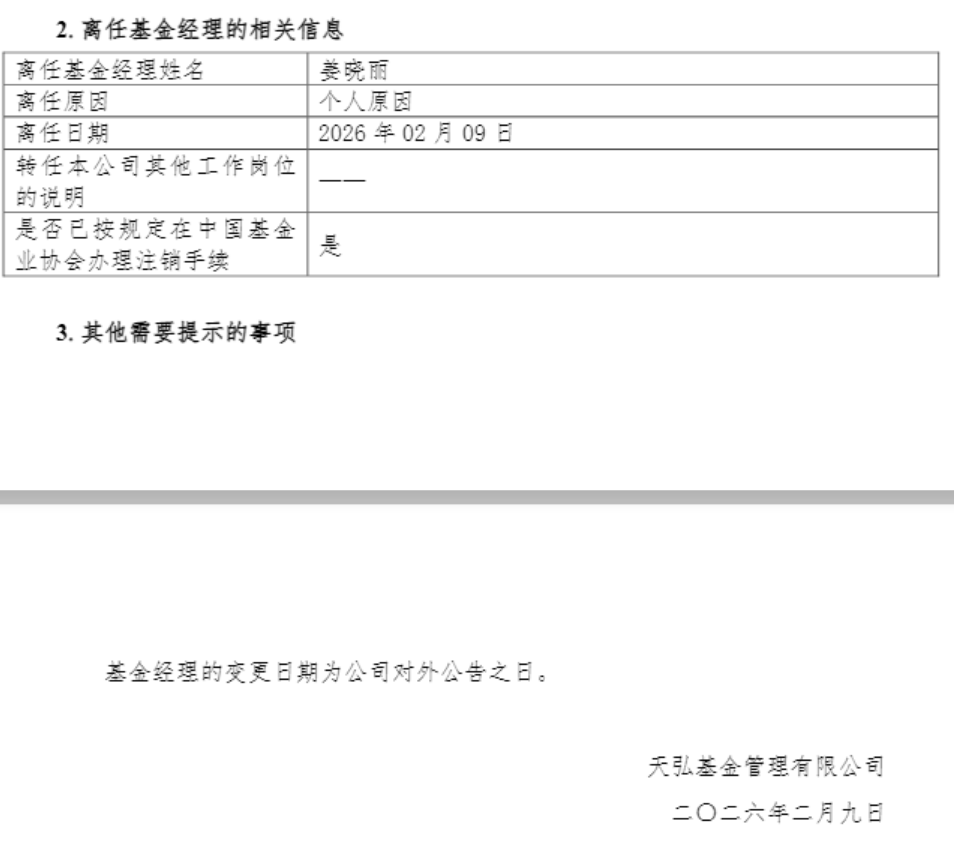核心事件概述 - 天弘基金旗下资深基金经理姜晓丽因个人原因于2月9日离任,并“清仓式”卸任其管理的全部10只公募基金产品 [1][3] - 姜晓丽在致投资者的信中表示,离职主要原因为长期高强度工作后希望彻底休假调整状态,自2009年工作以来从未休过长假 [1][7] - 截至离职前(去年四季度末),姜晓丽管理规模为350.24亿元,其职业生涯最高管理规模出现在2022年一季度末,达781.94亿元 [1][6] 基金经理个人背景 - 姜晓丽拥有超过16年证券从业经历与逾13年基金管理经验,职业生涯基本在天弘基金度过 [1][6] - 她于2009年以应届生身份加入天弘基金,从债券研究员和交易员做起,后成长为公司的“固收+”业务核心人物 [6] - 其管理的产品类型主要为固收类,包括偏债混合基金及混合二级债基 [1] 对公司及产品的影响与应对 - 天弘基金回应称,其“固收+”业务一直采用多基金经理共管模式,公司高度重视产品策略稳定性 [6] - 接任基金经理将继续执行既定投资目标与流程,投资范围无重大变化,投研团队将提供全面支持 [6] - 天弘基金主要依靠固收类产品推动规模增长,截至去年四季度末,公司公募管理总规模为13130.28亿元 [9] - 其中货币基金规模超过8200亿元,占比超过60%,债券型基金规模超过2400亿元,位居第二 [9] 行业动态与趋势 - 2025年开年以来,全市场累计已有超500位基金经理离任 [9] - 截至2月13日,2025年以来离职基金经理已达44位,较去年同期有所增加 [6] - 近年来公募基金经理离职已成行业常态,其中不乏知名基金经理 [9] 公司人员变动历史 - 天弘基金近五年来基金经理频繁变更,共有17位基金经理离职,平均每年至少有3位离职 [9] - 2024年和2025年共有8位基金经理离职,2026年至今共有2位基金经理离职 [9]
