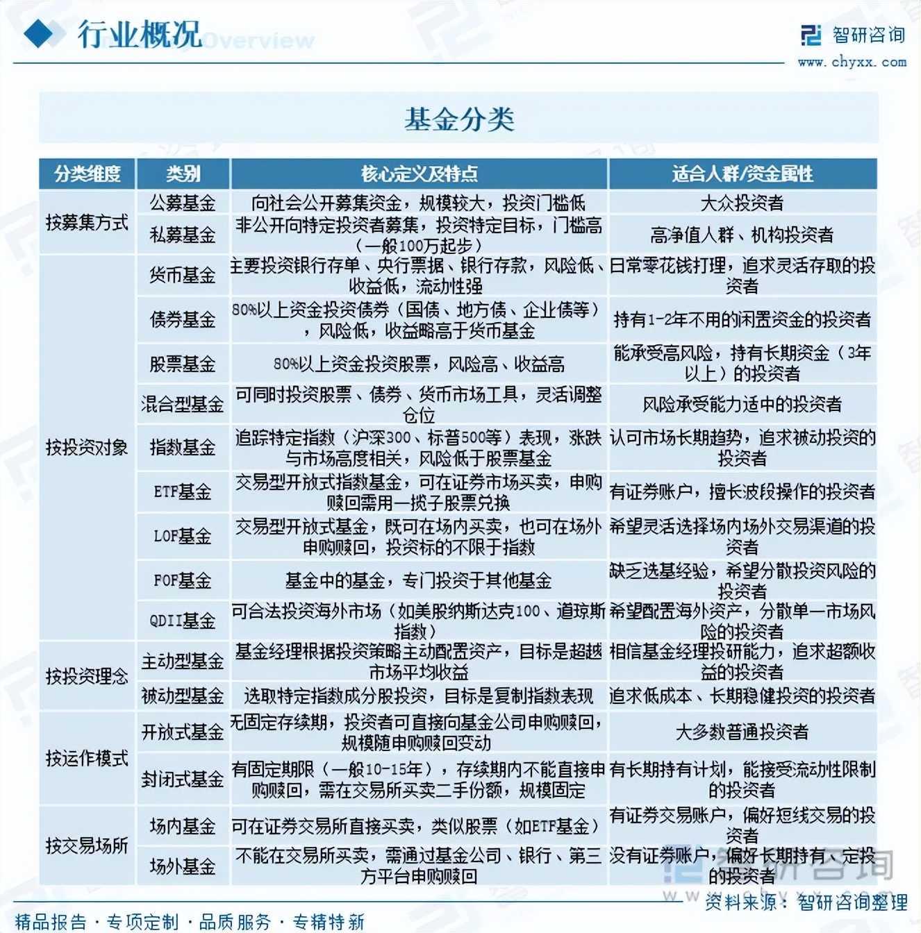 文章核心观点 - 中国居民资产配置结构正发生显著调整,资金从传统的储蓄和房地产领域加速向标准化的权益类、固收类基金产品迁移,基金行业在承接此轮财富迁移中拥有广阔发展空间 [1][10][15][24] - 截至2025年10月,中国基金行业已形成庞大且多层次的产品体系,基金总数量达151,286只,总规模达590,112.3亿元人民币,能够有效适配居民多元化的财富管理需求 [1][10][15][24] - 行业在政策支持、居民需求转型及资本市场开放等多重因素驱动下,正迈入专业化、多元化、国际化的高质量发展新阶段,同时行业竞争格局重塑,马太效应凸显 [6][20] 行业发展现状与规模 - 截至2025年10月,中国基金总数量为151,286只,其中公募基金13,381只,私募基金137,905只 [1][10][15][24] - 同期,中国基金总规模为590,112.3亿元人民币,其中公募基金规模为3,269,598.5亿元人民币,私募基金规模为220,513.8亿元人民币 [1][10][15][24] - 当前多层次的基金产品体系已初步形成,能够有效适配居民从保值向增值进阶的多元化财富管理需求 [1][10][15][24] 行业驱动因素与背景 - 房地产行业步入平稳发展新常态,叠加储蓄利率市场化持续下行,推动大众投资理财需求从单一保值诉求向多元增值目标进阶 [1][10][15][24] - 国民资产配置结构发生显著调整,资金正从传统的储蓄、房地产领域,加速向标准化的权益类、固收类基金产品迁移 [1][10][15][24] - 居民财富配置转型与资本市场对外开放构成行业发展的双重核心驱动力 [6][20] 基金产品分类体系 - 按募集方式可分为公募基金(向社会公开募集,门槛低)和私募基金(向特定投资者非公开募集,门槛一般100万起步) [3][5][17][19] - 按投资对象可分为货币基金、债券基金、股票基金、混合型基金、指数基金、ETF基金、LOF基金、FOF基金和QDII基金等主要类别 [3][5][17][19] - 按其他维度还可细分为主动型与被动型(投资理念)、开放式与封闭式(运作模式)、场内与场外(交易场所) [3][5][17][19] 行业发展历程与阶段 - 中国基金行业发展可划分为萌芽试点期、规范起步期、快速扩张期、转型调整期、高质量发展期五个核心阶段 [6][20] - 近年来行业迈入高质量发展新阶段,特征表现为专业化、多元化、国际化,产品创新向纵深推进 [6][20] - 特色创新产品不断落地,如公募REITs、养老目标基金、ESG主题基金等,填补了细分领域空白 [6][20] 行业竞争格局与趋势 - 行业竞争格局重塑,马太效应加剧,头部基金公司凭借投研、品牌、渠道优势持续扩大规模 [6][20] - 中小基金公司通过聚焦量化投资、细分赛道等差异化策略寻求突围 [6][20] - 对外开放步伐加快,外资公募基金公司陆续获批展业,带来成熟投资理念和产品设计经验,推动国内行业竞争升级 [6][20] 行业相关政策环境 - 国家高度重视基金行业发展,近年发布了一系列支持、鼓励和规范行业的政策,为行业发展提供了良好环境 [8][22] - 重要政策包括但不限于《关于金融支持住房租赁市场发展的意见》(提及稳步发展房地产投资信托基金)、《关于进一步强化金融支持绿色低碳发展的指导意见》(支持基础设施REITs)、《关于加强监管防范风险推动资本市场高质量发展的若干意见》(提及加快制定投资信托基金管理条例)以及《关于资本市场做好金融“五篇大文章”的实施意见》(推动机构加快财富管理转型)等 [10][24]