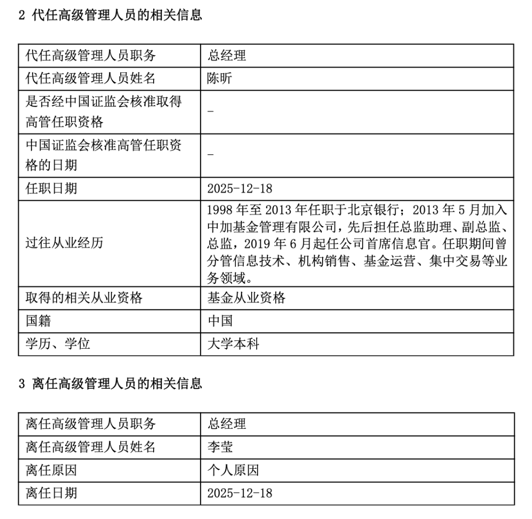 中加基金总经理李莹离职 12月19日,中加基金发布高级管理人员变更公告。总经理李莹因个人原因离职,公司首席信息官陈昕代任总经理。 12月19日,中加基金公告称,总经理李莹因个人原因离职,公司首席信息官陈昕代任总经理。 数据显示,中加基金成立于2013年,是一家"银行系"基金公司,北京银行为其第一大股东。中加基金代任总经理陈昕此前任职于北京银行信息技术部,董 事长杨琳此前也在北京银行工作多年。截至今年三季度末,中加基金旗下非货基金管理规模超过1100亿元。 【导读】任职不足两年,中加基金总经理李莹离职 继今年7月份新董事长上任之后,中加基金在年末又迎来总经理更迭。 杨琳此前历任北京银行资产管理部总经理助理、副总经理,公司银行部副总经理,党委宣传部部长、品牌管理部(客户体验部)总经理。 非货基金规模超1100亿元 公开资料显示,中加基金成立于2013年3月,是第三批银行系基金公司。公司注册资本为4.65亿元人民币,注册地为北京。 | 代任高级管理人员职务 | 总经理 | | --- | --- | | 代任高级管理人员姓名 | 陈昕 | | 是否经中国证监会核准取得 | | | 高管任职资格 | | | 中国证监 ...