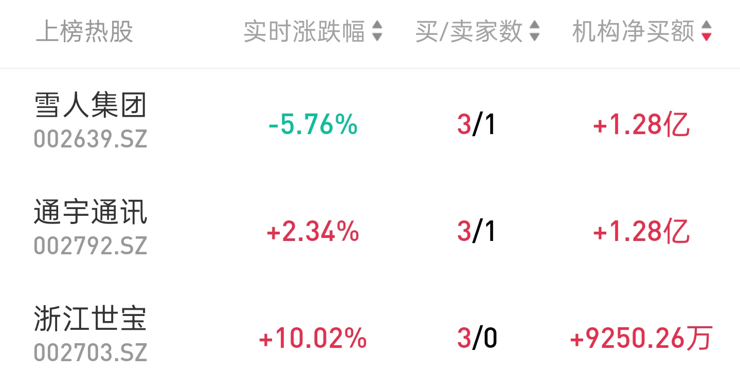 今天机构龙虎榜上榜38只个股,净买入19只,净卖出19只。当日机构买入最多的个股前三位是:雪人集团(1.28亿)、通宇通讯(1.28亿)、浙江世宝 (9250万) | 上榜热股 | 实时涨跌幅♀ 买/卖家数♀ | | | --- | --- | --- | | 雪人集团 002639.SZ | -5.76% | 3/1 | | 通宇通讯 002792.SZ | +2.34% | 3/1 | | 浙江世宝 002703.SZ | +10.02% | 3/0 | 浙江世宝 龙虎榜显示,今日3家机构净买入9250万。 公司在线控转向和后轮转向领域技术储备深厚,已获多家主流车企定点,线控转向首个量产项目预计于2026年下半年开始量产,后轮转向首个量产项目预计 于今年四季度开始量产,这两类产品分别主要面向L3+智能驾驶车型及高性能豪华车型,技术壁垒高,市场前景广阔 龙虎榜知名游资 龙虎榜机构热股 IT之家12月17日消息,SpaceX 已正式告知员工进入监管静默期,使公司距离计划明年启动的首次公开募股更进一步。 据智通财经报道,由中国航天科技集团八院抓总研制的长征十二号甲可重复使用运载火箭,计划于2025年12月中下旬 ...