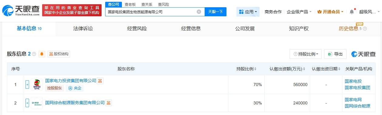 【大河财立方消息】天眼查工商信息显示,近日,国家电投集团生物质能源有限公司成立,注册资本80亿元人民币,经营范围包括太阳能发电技术服务、风 力发电技术服务、储能技术服务、生物质燃料加工、生物质成型燃料销售等。 股东信息显示,该公司由国家电力投资集团有限公司、国家电网旗下国网综合能源服务集团有限公司共同持股。 | 都在用的商业查询工具 | | | 更少回 查老板 查关系 查风险 | | | | | | | --- | --- | --- | --- | --- | --- | --- | --- | --- | | ZAHT | | 国家中小企业发展子基金旗下机构 | 国家电投集团生物质能源有限公司 | ැ | 天眼一下 | 脂 应用 · | 商务合作 企业级产品, ■ 开通: | | | 基本信息 10 | | 法律诉讼 | 经营风险 | 经营信息 | | 公司发展 | 知识产权 | | | 股东信息20 ■ 品股权结构 | | | | | | | 2持股比例 - 国 | | | 序号 | | | 股东名称 | | | 持股比例 # | 认缴出资额(万元); 认缴出资日 | | | 国家电力投资集团有限公司 ...
