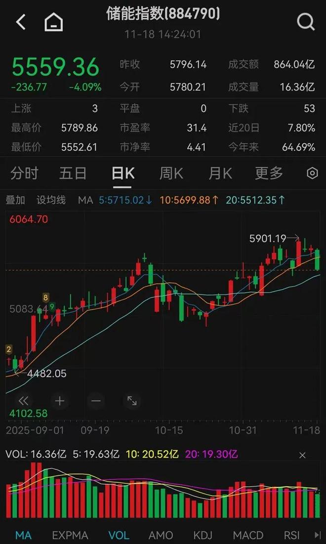 储能指数市场表现 - 储能指数午后持续调整,截至发稿下跌超4% [1] - 指数当日点位为5559.36点,较昨日收盘价5796.14点下跌236.77点,跌幅4.09% [2] - 指数年内表现强劲,今年来累计上涨64.69% [2] - 近20个交易日指数累计上涨7.80% [2] - 指数月内累计上涨5.71% [1] 储能指数交易数据 - 指数当日成交额为864.04亿 [2] - 指数当日成交量为16.36亿 [2] - 指数成分股中上涨家数为3家,下跌家数为53家 [2] - 指数当日最高价为5789.86点,最低价为5552.61点 [2] 储能个股表现 - 富临精工跌幅居首,跌超15% [4] - 中能电气、海博思创、万润新能等多股跌超10% [4] - 阿特斯、鹏辉能源、永福股份、奥特迅、派能科技跌幅居前 [4] - 储能电池ETF(159566)跌超3%,该ETF昨日获净流入超2亿元 [5]