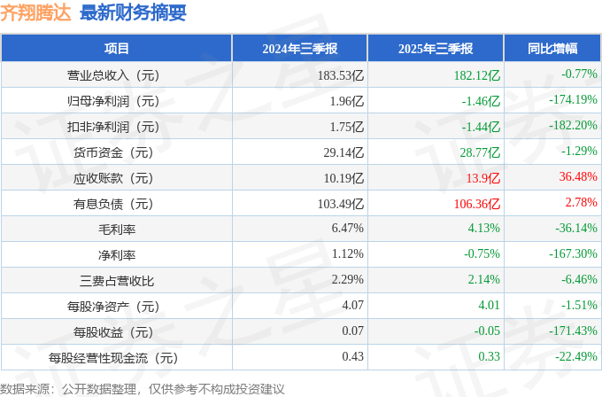 据证券之星公开数据整理,近期齐翔腾达(002408)发布2025年三季报。截至本报告期末,公司营业总 收入182.12亿元,同比下降0.77%,归母净利润-1.46亿元,同比下降174.19%。按单季度数据看,第三季 度营业总收入60.04亿元,同比上升6.75%,第三季度归母净利润-1.69亿元,同比下降393.61%。本报告 期齐翔腾达应收账款上升,应收账款同比增幅达36.48%。 本次财报公布的各项数据指标表现不尽如人意。其中,毛利率4.13%,同比减36.14%,净利率-0.75%, 同比减167.3%,销售费用、管理费用、财务费用总计3.9亿元,三费占营收比2.14%,同比减6.46%,每 股净资产4.01元,同比减1.51%,每股经营性现金流0.33元,同比减22.49%,每股收益-0.05元,同比减 171.43% | 项目 | 2024年三季报 | 2025年三季报 | 同比增幅 | | --- | --- | --- | --- | | 营业总收入(元) | 183.53亿 | 182.12 Z | -0.77% | | 归母净利润(元) | 1.96亿 | -1.46 Z | -174.1 ...