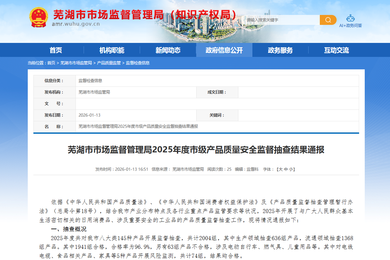 安徽省芜湖市市场监督管理局公布2025年度市级产品质量安全监督抽查结果