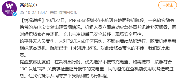 新京报讯 10月27日,西部航空官博发布情况说明,内容如下: 10月27日,PN6333深圳-济南航班在地面登机阶段,一名旅客随身携带的充电宝突然出现冒烟情况。机 组人员立即启动应急处置并迅速扑灭烟雾,同时组织旅客有序离机,充电宝冷却后已安全转移,现场安 全可控。 该事件无人员受伤、未对飞机造成任何损伤,不影响后续航班运行,随后机组重新组织旅客登机,航班 已于11:45顺利起飞。对此给旅客带来的不便,我们深表歉意。 提醒旅客朋友们,在乘机出行时,优先选择不携带充电宝,如需携带,按照符合"3C 认证"等相关要求 检查随身携带的充电宝,同时避免在登机前使用设备造成过热。让我们携手共同守护平安顺利的飞行旅 程。 ...