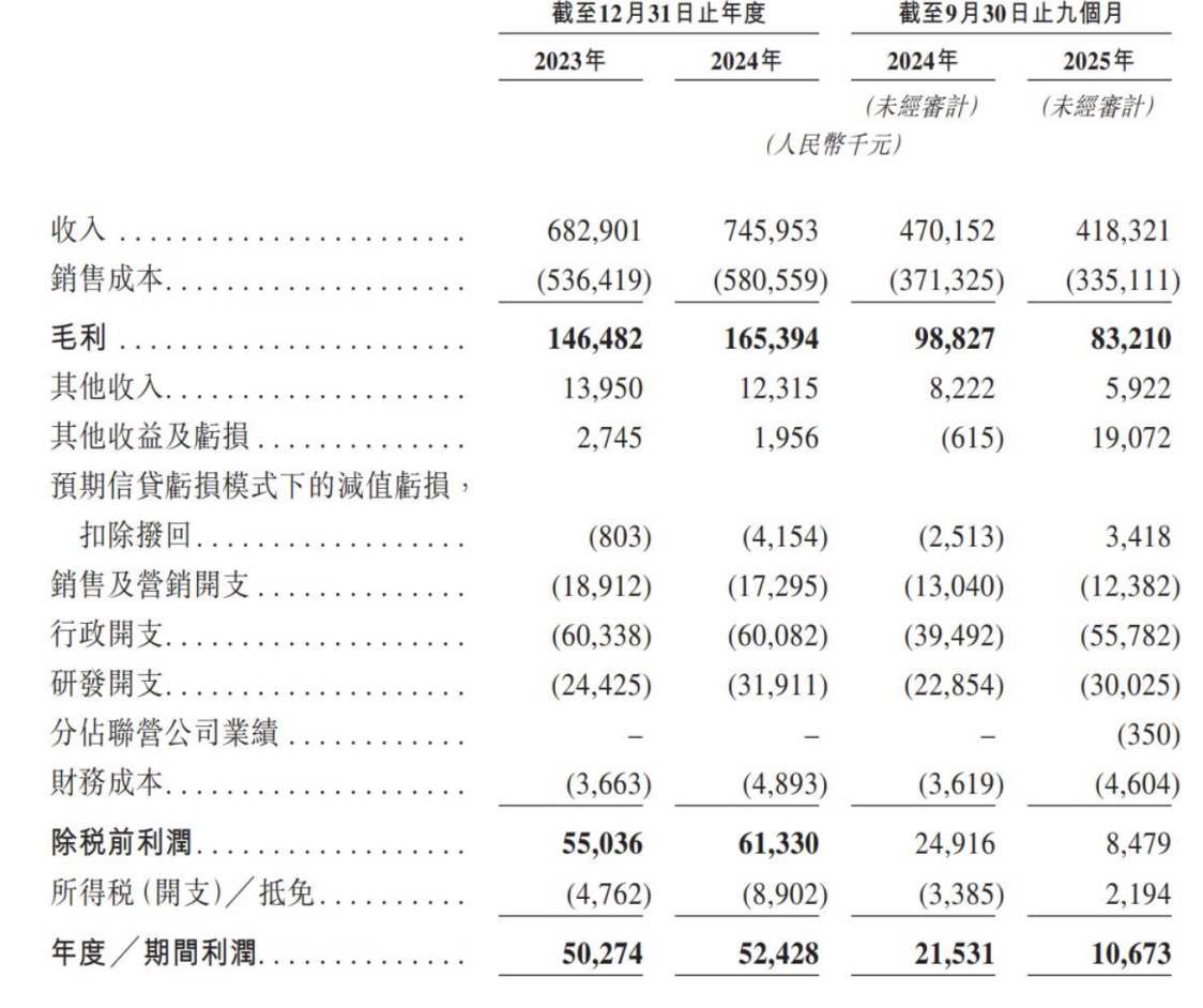 行业与公司战略背景 - 中国制造业正从规模化设备集成的“机器堆叠”阶段,迈向数据驱动、系统耦合的“智能协同”深度转型期 [1] - 上海精智实业股份有限公司作为深耕制造全流程端到端优化解决方案的服务商,正式向香港交易所主板递交上市申请 [1] - 公司的发展逻辑遵循行业主流叙事,旨在通过提升“先进装备解决方案”及“通信热管理解决方案”的占比,向技术驱动、高附加值的解决方案提供商转型,并强调“端到端优化”以覆盖全链条 [7] - 赴港上市募集资金旨在进一步投入研发,强化智能化、数字化能力,以支撑解决方案的持续迭代与商业化拓展 [7] 整体财务表现 - 2023年全年收入为68.29亿元,2024年收入增长至74.60亿元,但增长动力显疲态 [2] - 2025年前九个月收入为41.83亿元,较2023年同期的47.02亿元同比下滑约11.1% [2] - 2023年全年除税前利润为5.50亿元,净利润为5.03亿元 [2] - 2025年前九个月除税前利润骤降至8479万元,净利润为1.07亿元,对比2024年同期的除税前利润2.49亿元与净利润2.15亿元,分别暴跌约66%和50% [2] - 利润的缩水速度远超收入下滑幅度,凸显盈利质量正在恶化 [2] 盈利能力与成本分析 - 2023年全年毛利率为21.5%,2025年前九个月毛利率微升至22.2%,但绝对毛利额因收入下降而减少 [3] - 2025年前九个月研发开支达3.00亿元,已接近2024年全年3.19亿元的水平,占收入比从2024年全年的4.7%大幅攀升至7.2% [4] - 2025年前九个月行政开支高达5.58亿元,较2024年同期的3.95亿元激增41.3% [4] - 三项主要期间费用(研发、行政、销售)合计占收入的比例,从2024年前九个月的约16.0%,飙升至2025年同期的约23.5% [4] - 费用率的急剧攀升直接吞噬了毛利,成为净利润断崖式下跌的主因之一 [4] 业务分部表现 - “先进装备解决方案”作为收入基石(占比超40%),在2025年前九个月收入同比下滑22.7% [7] - “精密零部件”业务收入占比从2024年同期的28.6%升至2025年前九个月的32.3% [8] - “通信热管理”业务收入占比从2024年同期的12.2%升至2025年前九个月的16.9% [8] - “其他”业务收入占比从2024年同期的11.6%降至2025年前九个月的9.4% [8] - 2025年前九个月总收入下滑11.0%,显示业务组合尚未形成可持续的内生增长动力 [8] 业务分部盈利能力 - “先进装备解决方案”毛利率在2025年前九个月异常跃升至33.2%,与收入锐减形成矛盾 [9] - “精密零部件”毛利率从2024年同期的21.2%大幅下滑至2025年前九个月的13.1% [9] - “通信热管理”毛利率从2024年同期的11.2%下滑至2025年前九个月的7.1% [9] - 公司整体毛利率从2024年同期的21.0%降至2025年前九个月的19.9% [9] - 向解决方案转型并未系统性地提升其议价能力和盈利水平 [9] 财务报表异常项目 - 其他收益及亏损项在2025年前九个月录得高达1.91亿元的正向收益,而2024年同期为亏损615万元,此项巨额的波动性收益掩盖了主营业务盈利能力的真实下滑 [5] - 预期信贷亏损模式下的减值亏损在2025年前九个月出现3418万元的拨回(收益),而2024年同期为计提2513万元亏损,此项属于非经常性项目,增加了利润的“水分” [6] - 经营活动现金流连续三年为负,速动比率低于1,短期偿债能力显露出紧张迹象 [6]
