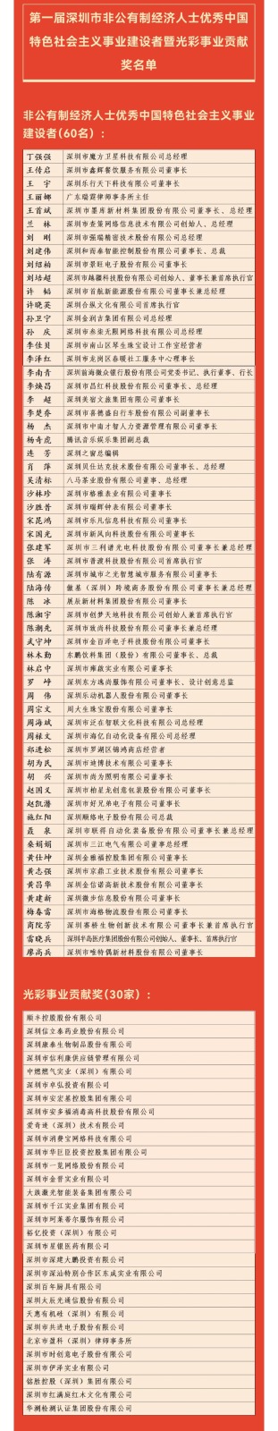 深圳市工商联主席、朗华集团董事长张春华表示,深圳是"民营经济第一城",企业要敢投创新之所急, 敢闯技术之所难,在关键核心技术上攻坚,在重点产业链上突破,在发展新质生产力上走在前列,积极 投身深圳冲刺4万亿GDP的宏伟征程。 深圳市工商联副主席、深圳市科达利实业股份有限公司总裁励建炬向记者表示,民营企业既是参与者更 是受益者。科达利将以全会精神为指引,坚守实业报国初心,勇担科技创新使命,在新能源汽车动力电 池精密结构件领域持续创新突破,让"深圳智造"闪耀全球,为深圳的先行示范区建设和中国式现代化建 设贡献民企力量。 11月1日,第七届"深圳企业家日"学习贯彻党的二十届四中全会精神深圳企业家日活动在前海国际会议 中心举行。 会上宣读了"第一届深圳市非公有制经济人士优秀中国特色社会主义事业建设者暨光彩事业贡献奖"表彰 决定,丁强强等60人获评"深圳市非公有制经济人士优秀中国特色社会主义事业建设者"称号,顺丰控股 股份有限公司等30家企业荣获"深圳市光彩事业贡献奖"。 这是深圳首次以市委、市政府名义表彰全市非公有制经济人士优秀中国特色社会主义事业建设者暨光彩 事业贡献者。 根据深圳市工商联数据,截至2025年6月底, ...