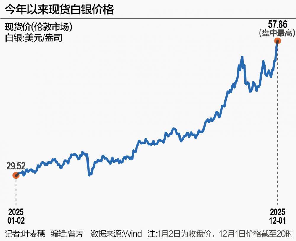 核心观点 - 多重因素共振推动白银价格大幅上涨,市场预期其仍有修复空间 [6][7][8][9] 价格表现 - 现货白银历史首次触及57美元/盎司,日内涨幅一度超过2.5%,今年以来涨幅已达98% [1] - COMEX白银盘中突破58美元/盎司,日内涨1.47% [1] - 上海期货交易所白银主力合约价格涨至13520元/公斤,日内涨幅超过7% [1][5] - 白银价格月线已连续上涨8个月 [1][5] - 现货白银在9月突破40美元/盎司后,于10月9日突破50美元/盎司,一个多月涨幅超过20%,12月1日盘中最高触及57.863美元/盎司 [4] 驱动因素:宏观与政策 - 市场普遍预期美联储将降息,CME“美联储观察”数据显示12月降息25个基点的概率为87.4% [3] - 高盛认为美联储12月降息几乎板上钉钉,当前市场定价概率约85%-86% [3] - 美联储降息预期移除贵金属价格压力,推动金银重拾升势 [4] - 经济就业下行、通胀上行叠加流动性宽松的环境对白银构成利好 [9] 驱动因素:供需基本面 - 近5年来全球白银实物供应处于短缺状态 [7] - 白银工业属性增强,太阳能产业爆发式增长推动光伏银浆需求剧增 [7] - 世界白银协会预计2025年全球白银供应缺口将收窄至1.176亿盎司 [8] - 供需结构性紧俏加上库存偏低,使白银具备较强价格弹性 [8] 估值与前景 - 当前内盘金银比约为82,外盘约为85,显著高于过去50年与20年的历史均值(分别为63和70),表明白银估值仍处相对低位,具备比价修复空间 [9] - 美国经济韧性及预防式降息后经济可能触底反弹的预期,利好白银的工业金属属性 [9] - 景顺资产管理公司主管认为,长期来看白银价格将维持相对高位,并可能持续上涨 [10] - 招商期货研究报告表示,贵金属仍值得长期配置以对冲货币信用风险,白银会随黄金做更高弹性的脉冲式上行 [10] 资金流向 - 近期白银市场资金流入主要来自机构投资者和个人投资者 [10] - 机构资金通过ETF、期货合约及实物持有布局白银,全球白银ETF持仓显著攀升,COMEX白银期货投机性净多仓处于历史峰值区间 [10] - 全球最大白银ETF——SLV最新持仓量为15610.54吨,相比前一日增加28.21吨,维持高位 [11] - 个人投资者因白银“大众贵金属”特性广泛参与,此轮行情激发散户热情,加剧短期价格波动 [10] - 由于近期涨幅巨大,投资银条、银元宝等产品销量同比激增40%以上 [12]