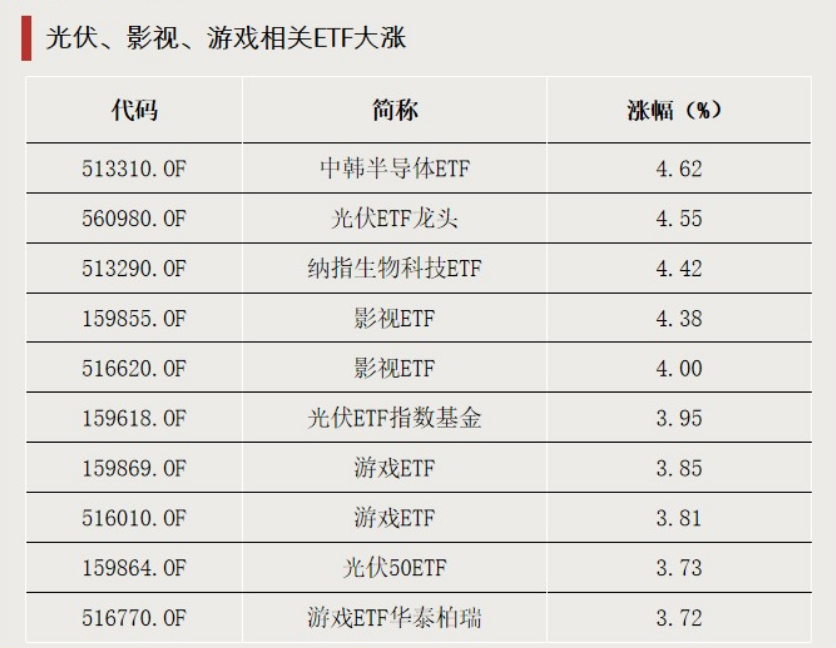 01 11月3日,光伏概念午后走强,阿特斯、海目星涨超10%。涨幅居前的ETF中出现了三只光伏ETF,其中,光伏ETF龙头 (560980)涨幅达4.55%,光伏ETF指数基金、光伏50ETF涨幅均超3.7%。 11月3日,A股市场先抑后扬。午后市场上演"大反攻",截至收盘,三大指数全部翻红。盘面上,市场热点快速轮动, 光伏概念午后走强,带动相关ETF大涨,影视传媒板块的强势表现也带动影视、游戏相关ETF上涨。 11月3日,游戏、影视院线等板块涨幅居前,带动相关ETF上涨。涨幅居前的ETF中有2只影视相关ETF以及3只游戏相 关ETF。其中,2只影视相关ETF涨幅分别达到或超过4%。 02 | 代码 | 简称 | 涨幅(%) | | --- | --- | --- | | 513310. OF | 中韩米导体ETF | 4. 62 | | 560980. OF | 光伏ETF龙头 | 4. 55 | | 513290. OF | 纳指生物科技ETF | 4. 42 | | 159855. OF | 影视ETF | 4. 38 | | 516620. OF | 影视ETF | 4. 00 | | 159618. ...
