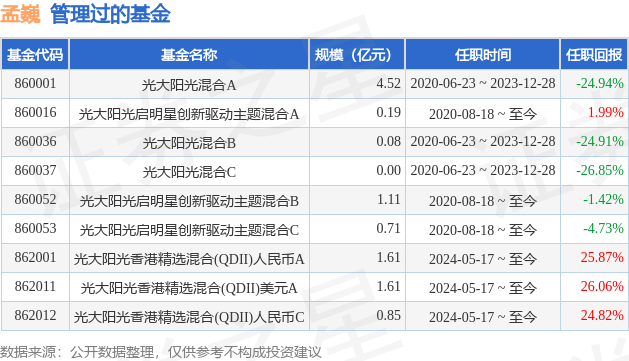 光大阳光对冲6个月混合A基金经理变动:增聘孟巍为基金经理