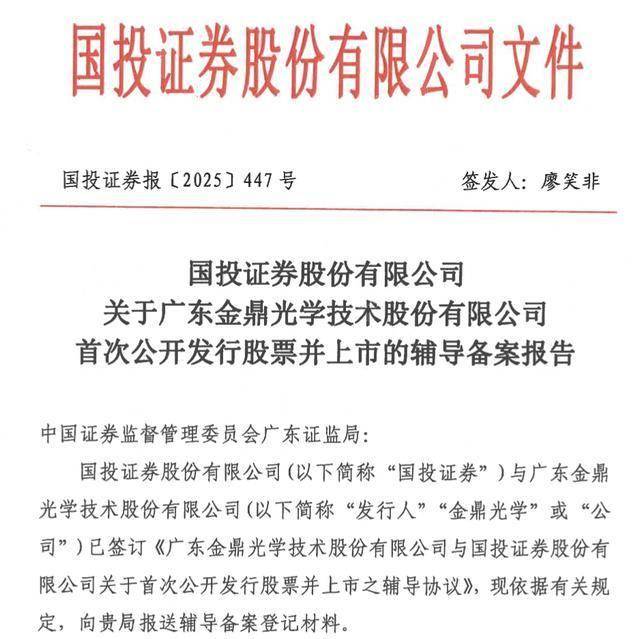 本次IPO的辅导机构为国投证券股份有限公司,律师事务所为北京市中伦律师事务所,会计师事务所为立信会计师事务所(特殊普通合伙)。 | JID A IHA A IHAN 辅导协议签署时间 | 2025年11月12日 | | --- | --- | | 辅导机构 | 国投证券股份有限公司 | | 律师事务所 | 北京市中伦律师事务所 | | 会计师事务所 | 立信会计师事务所(特殊普通合伙) | 瑞财经 吴文婷11月17日,广东金鼎光学技术股份有限公司(以下简称"金鼎光学")启动IPO。 公开资料显示,金鼎光学成立于2011年8月10日,致力于精密光学智能生产设备及精密光学器件研发、生产销售。 经过多年持续研发,公司开发出全自动非球面精密模压机(系列)、超精密单点金刚石车床、超精密非球面磨削机床、光学冷加工设备及其自动化等设备;此 外公司具有光学镜片、光学镜头、镀膜技术等精密光电子产品的生产能力。公司产品销往日本、美国、德国等国家和中国香港、中国台湾地区。 值得注意的是,公司股票曾于2016年8月8日起在全国中小企业股份转让系统挂牌公开转让,自2019年4月11日起终止在全国股转系统挂牌,期间不到3年。 | 辅导对 ...