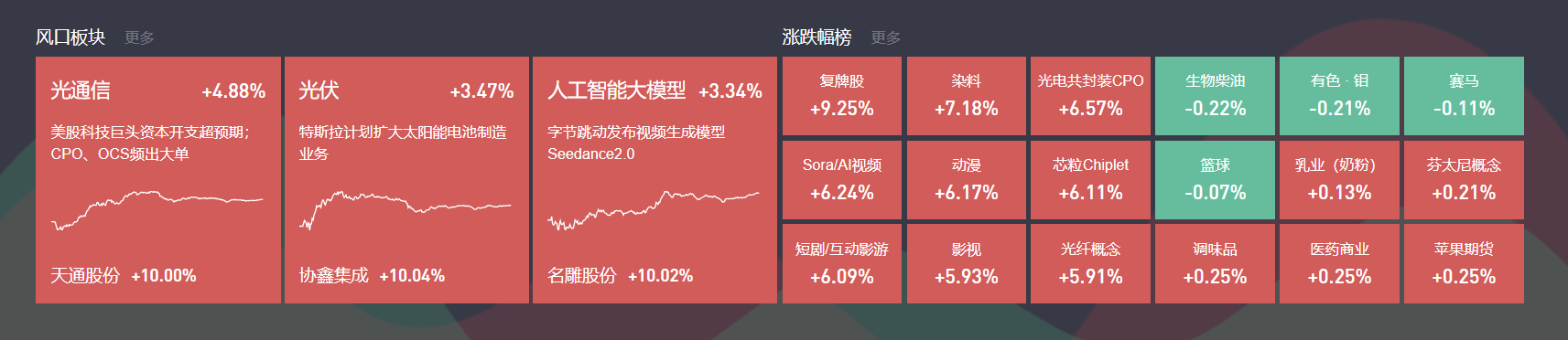 2月9日主题复盘 | 三大指数集体大涨,光通信全线强势,光伏热度不减,AI应用再度爆发
