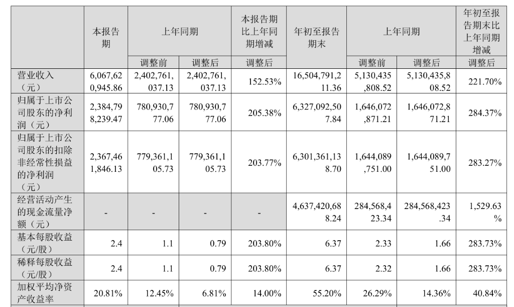 核心业绩表现 - 2025年第三季度公司实现营业收入60.68亿元人民币,同比增长152.53% [1][5] - 2025年第三季度归属于上市公司股东的净利润达到23.85亿元,同比增长205.38% [1][5] - 2025年前三季度公司累计营业收入为165.05亿元,同比增长221.70% [2] - 2025年前三季度累计净利润为63.27亿元,同比增长284.37% [2] - 业绩增长主要得益于人工智能算力投资发展带来的旺盛市场需求 [1][2] 盈利能力与效率 - 2025年第三季度基本每股收益为2.4元/股,同比增长203.80% [1] - 2025年前三季度加权平均净资产收益率为55.20%,同比提升40.84个百分点 [1] - 2025年前三季度经营活动产生的现金流量净额为46.37亿元,同比增长1,529.63% [1] 成本与费用结构 - 2025年前三季度营业成本同比增长194.30%至87.07亿元,主要因销售规模扩大 [2] - 2025年前三季度研发费用达5.01亿元,同比增长149.57%,以维持技术领先和市场竞争力 [2] - 2025年前三季度销售费用同比增长96.88%,因市场开拓与人员薪酬增加 [2] - 财务费用同比大幅下降179.49%,主要由于境外子公司记账本位币升值产生显著汇兑收益 [2] 资产负债状况 - 截至报告期末公司总资产达到213.56亿元,较上年度末增长74.10% [3] - 货币资金余额增至54.39亿元,较年初大增239.86%,主要来自强劲的销售回款及税费返还 [6] - 存货升至66.03亿元,较年初增长59.79%,为应对在手及预期订单 [6] - 应收账款增至39.93亿元,随着销售额的扩大而增加 [6] - 应付票据及应付账款分别增长110.82%和55.03%,随着原材料采购规模扩大 [6] - 应付职工薪酬较年初大幅增长131.00%,反映公司员工规模或薪酬水平提升 [6]