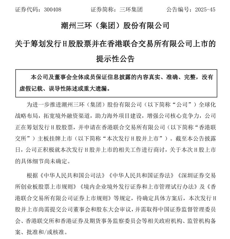 港股IPO计划 - 公司正在筹划发行H股股票并申请在香港联交所主板挂牌上市 [1] - 此次港股IPO旨在推进全球化战略布局 拓宽境外融资渠道 助力海外项目建设 [1] - 关于H股上市的具体细节尚未确定 公司正积极就相关工作进行商讨 [1] 公司基本情况 - 公司成立于1970年 是全国领先的电子元件和先进材料产业基地 [1] - 自2014年12月在深交所上市以来 公司总市值已突破990亿元 [1] - 公司是被动电子元件及材料供应商 产品销往美国 欧洲及东南亚等国家和地区 [1] 产品与技术 - 公司产品结构包括移动终端陶瓷部件 光通信陶瓷部件 陶瓷基板 陶瓷封装基座 MLCC等 [1] - 其他主导产品包括燃料电池电解质隔膜片 接线端子 传统电阻 电阻用陶瓷基体等 [1] - 公司在国内外建立起广泛的销售网络 [1] 2025年前三季度财务表现 - 公司前三季度营业收入为65.08亿元 同比增长20.96% [2] - 归属于上市公司股东的净利润为19.59亿元 同比增长22.16% [2] - 扣除非经常性损益的净利润为17.06亿元 同比增长18.74% 基本每股收益为1.02元 [2]