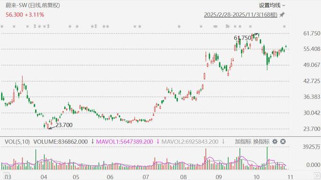 此外,蔚来还宣布全新ES8交付破万。蔚来品牌与传播助理副总裁马麟表示,11月全新ES8交付将进一 步加速,产能较10月预计将有70%的提升。 蔚来-SW(9866.HK)盘初涨4.5%报57.1港元。消息面上,蔚来汽车宣布,2025年10月交付40397辆,创下 月度新纪录,同比增长92.6%;2025年年初至今交付241618辆,同比增长41.9%。 ...