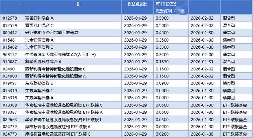 市场资金流入与指数表现 - 大量资金正通过公募基金渠道进入股市 今年以来新发基金规模已突破千亿元 其中权益类基金与FOF是主要增量 多只产品发行规模超过30亿元并出现“日光”基 目前仍有百余只基金排队待售 渠道预计春节前后新发节奏将保持高位 为市场持续输送增量资金 [1] - 1月29日A股市场指数表现分化 沪指窄幅震荡收盘上涨0.16%报4157.98点 深成指下跌0.3%报14300.08点 创业板指下跌0.57%报3304.51点 科创50指数大幅下跌3.03%报1507.64点 而上证50指数上涨超过1% 市场成交额达32594亿元 较上一交易日放量2671亿元 超过3500只个股下跌 [1] 基金发行与分红动态 - 1月29日共有6只新基金发行 主要为股票型基金和基金中的基金(FOF) 其中博时盈泰臻选6个月持有期混合(FOF)A的募集目标金额达到80.00亿元 [2] - 同日有17只基金进行分红 以债券型基金为主 派发红利最多的基金是富国红利混合型证券投资基金 每10份基金份额派发红利0.5000元 [2] - 根据基金分红一览表 富国红利混合A/C、兴业安和6个月定期开放债券、兴全恒信债券A/C等多只基金在1月29日进行了权益登记并公布了分红方案 [3] 行业业绩与展望 - 2025年公募基金行业利润突破2.6万亿元 投资者获得感显著提升 展望2026年 机构普遍认为随着资本市场深化改革、企业盈利持续改善以及长期资金加速入市 科技等核心赛道的投资逻辑愈发清晰 基金行业在居民财富积累与资产配置中的功能将进一步强化 有望迎来新一轮高质量发展 [2] - 公募REITs 2025年四季报显示 77只产品合计营收59.13亿元 净利润5.26亿元 超过七成产品实现盈利 尽管产业园和仓储物流领域仍面临压力 但底层资产出租率与租金水平总体保持稳健 “以价换量”策略带动了部分项目现金流改善 随着扩募落地和资产类型拓宽 REITs板块有望维持稳中向好态势 为2026年的分红提供支撑 [2]