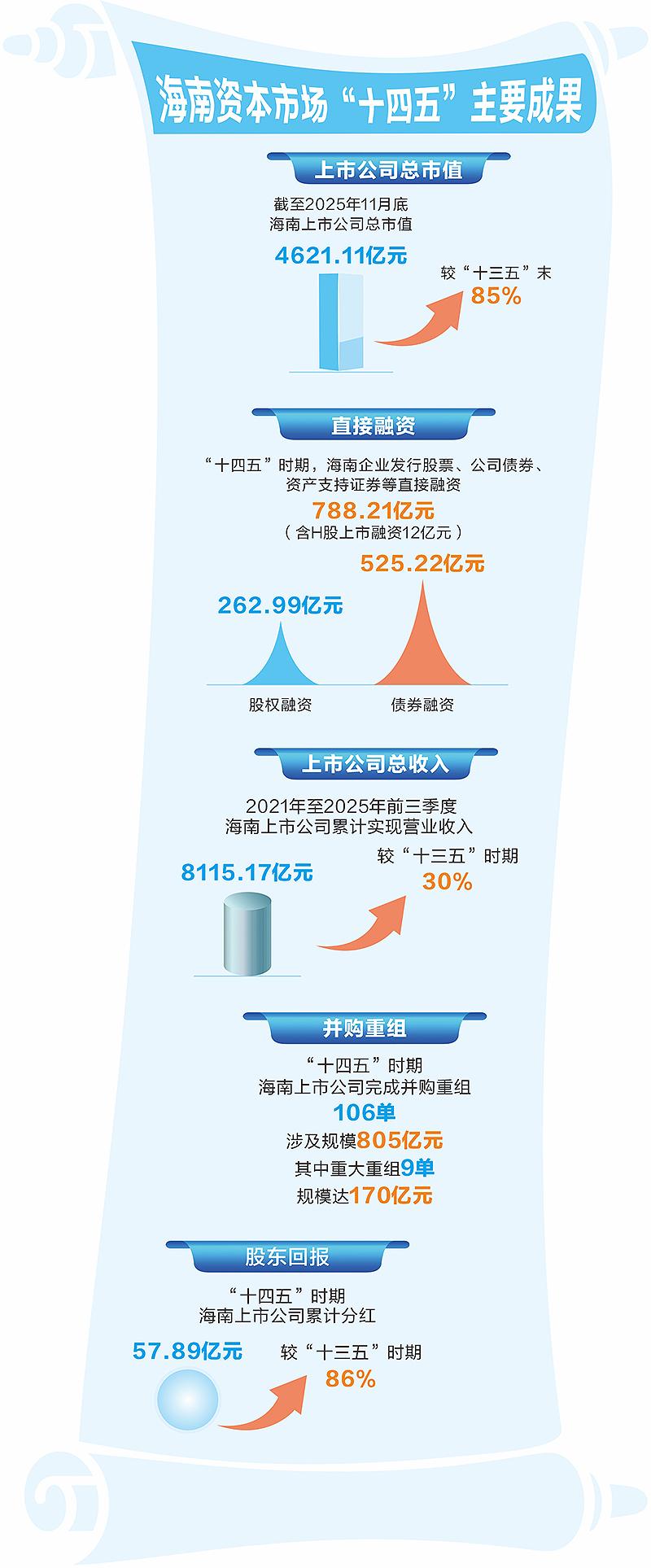 在自贸港政策红利与资本市场改革深化的双重驱动下,海南资本市场交出了一份规模与质量双升的亮眼答卷:五 年来累计实现直接融资788.21亿元,上市公司总市值较"十三五"末增长85%,达4621.11亿元,百亿级市值企业扩 容至14家,并购重组规模突破800亿元,累计分红同比增长86%。这些实打实的数据,不仅为旅游业、现代服务 业、高新技术产业等注入强劲金融动能,更筑牢了自贸港高质量发展的资本根基。 "十四五"时期,海南自由贸易港建设实现从"开局起步"到"成型起势"的关键跨越,并在2025年12月18日迎来全岛 封关运作的历史时刻。 资本活水精准滴灌 产业升级蹄疾步稳 "十四五"时期,海南资本市场充分发挥资源配置核心功能,通过股权融资、债券发行、并购重组等多元化工具, 将金融活水精准导入实体经济重点领域,推动产业结构优化升级,为自贸港"三区一中心"战略定位提供坚实支 撑。 直接融资规模大幅增长,为企业发展注入"真金白银"。五年来,海南企业通过发行股票、公司债券、资产支持证 券等方式实现直接融资788.21亿元(含H股上市融资12亿元),其中股权融资262.99亿元,债券融资525.22亿元, 有力支持了企业转型升级 ...