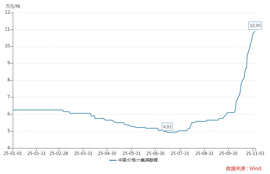 记者丨董鹏 编辑丨巫燕玲 连续下跌三年的六氟磷酸锂,近期异动明显。 Wind数据显示,四季度以来,国内六氟磷酸锂价格迅速拉涨,其现货价格由9月末的6.1万元/吨升至10月末的10.75万元/吨,月度 涨幅达到76%。 截至11月3日,六氟磷酸锂价格继续走高,报10.9万元/吨 产品价格的明显上涨,叠加披露三季报的窗口期,使得天赐材料等头部企业重新获得机构关注。 "主要由下游新能源与储能产业需求爆发、供给端产能集中且扩产谨慎的供需矛盾及原材料价格波动共同推动。"多氟多近期接受 调研时指出。 综合其他头部企业反馈来看,受到行业近几年资本开支低位运行等因素影响,六氟磷酸锂价格仍存上行空间,供应紧平衡状态可 能持续至2026年,同时其他供需关系紧张的添加剂,后续也存在涨价的可能性。 行业景气度提升拉动企业盈利增长预期下,部分卖方大幅上调了相关企业的目标价。 比如天赐材料,11月3日便有机构给出了67.75元的目标价,这较公司当前最新价有接近70%的潜在上涨空间,招商证券等机构更 是将其推为11月金股。 价格仍有可能继续上涨 2022年2月,六氟磷酸锂价格一度达到59万元/吨,但是经过近三年半的持续回落,到今年7月一度 ...