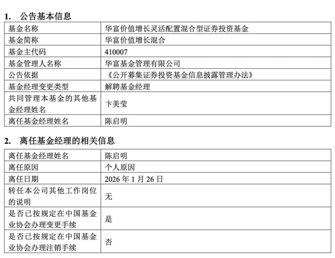 【导读】多位知名基金经理卸任在管基金 2026年开年以来,已有多位知名基金经理卸任在管基金。 继去年底卸任华富基金副总经理"专注于投资管理工作"之后,陈启明如今又卸任大部分基金的基金经理职务。 此外,华安基金蒋璆、兴证全球基金董理等知名基金经理近期也卸任了在管基金。 陈启明卸任大部分基金 1月27日,华富基金旗下华富价值增长灵活配置混合、华富成长企业精选股票、华富卓越成长一年持有期混合、华富成长趋势混合接连发布基金经理变更 公告,陈启明因个人原因于2026年1月26日离任上述基金的基金经理。 | 基金名称 | 华富价值增长灵活配置混合型证券投资基金 | | --- | --- | | 基金简称 | 华富价值增长混合 | | 基金主代码 | 410007 | | 基金管理人名称 | 华富基金管理有限公司 | | 公告依据 | 《公开募集证券投资基金信息披露管理办法》 | | 基金经理变更类型 | 解聘基金经理 | | 共同管理本基金的其他基 金经理姓名 | 卞美莹 | | 离任基金经理姓名 | 陈启明 | | 离任基金经理姓名 | 陈启明 | | --- | --- | | 离任原因 | 个人原因 | | 离任 ...
