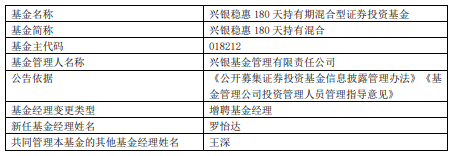 | 基金名称 | 兴银稳惠 180天持有期混合型证券投资基金 | | --- | --- | | 基金简称 | 兴银稳惠 180 天持有混合 | | 基金主代码 | 018212 | | 基金管理人名称 | 兴银基金管理有限责任公司 | | 公告依据 | 《公开幕集证券投资基金信息披露管理办法》 《音 | | | 金管理公司投资管理人员管理指导意见》 | | 基金经理变更类型 | 增聘基金经理 | | 新任基金经理姓名 | 罗恰达 | | 共同管理本基金的其他基金经理姓名 | 王深 | (责任编辑:康博) 中国经济网北京11月4日讯 今日,兴银基金公告,兴银稳惠180天持有混合增聘罗怡达。 罗怡达历任淡水泉(北京)投资管理有限公司投资经理、广发证券资产管理(广东)有限公司权益 研究部负责人。2024年1月加入兴银基金管理有限责任公司,现任权益投资部基金经理。 兴银稳惠180天持有混合A/C成立于2023年4月26日,截至2025年11月3日,其今年来收益率为 6.43%、6.34%,成立来收益率为15.27%、14.97%,累计净值为1.1527元、1.1497元。 ...