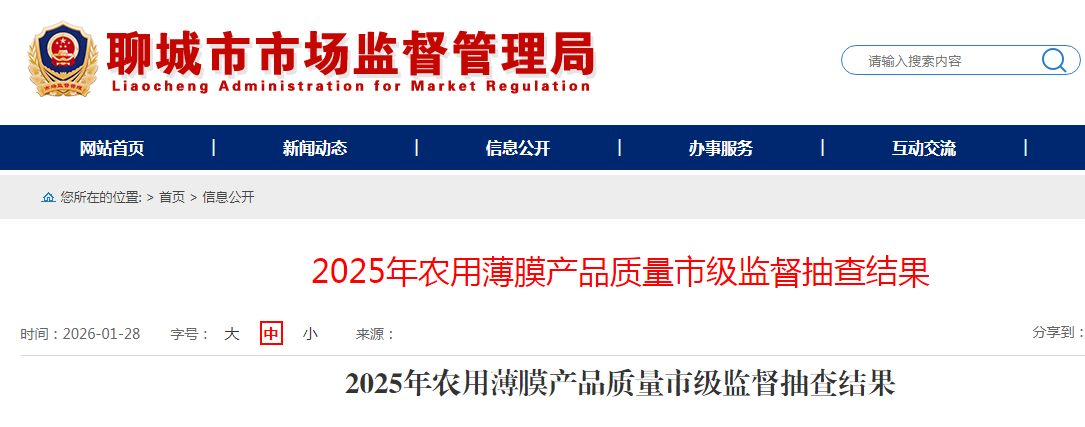 山东省聊城市市场监督管理局公布2025年农用薄膜产品质量市级监督抽查结果