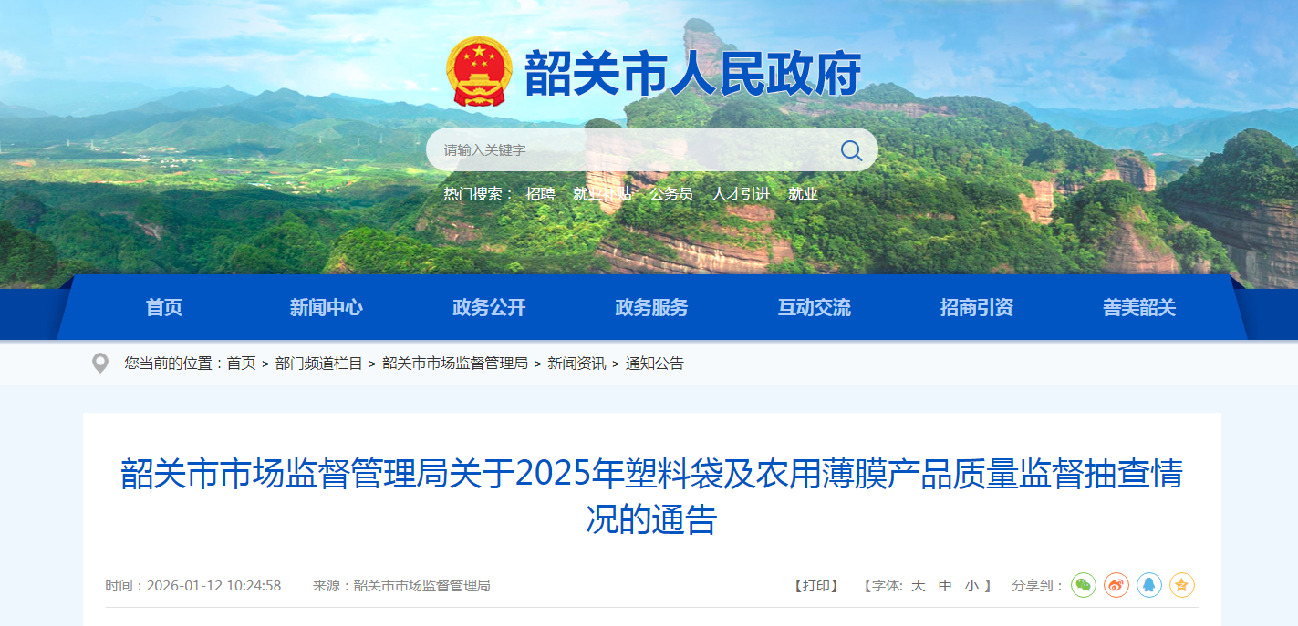 广东省韶关市市场监督管理局发布2025年塑料袋及农用薄膜产品质量监督抽查情况