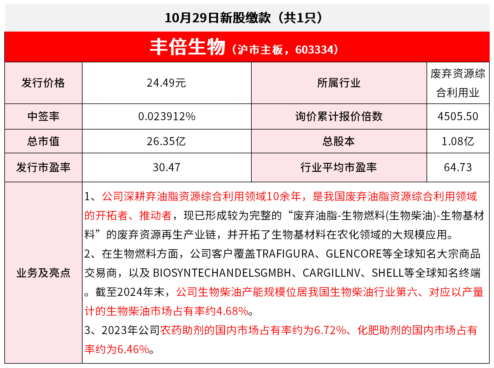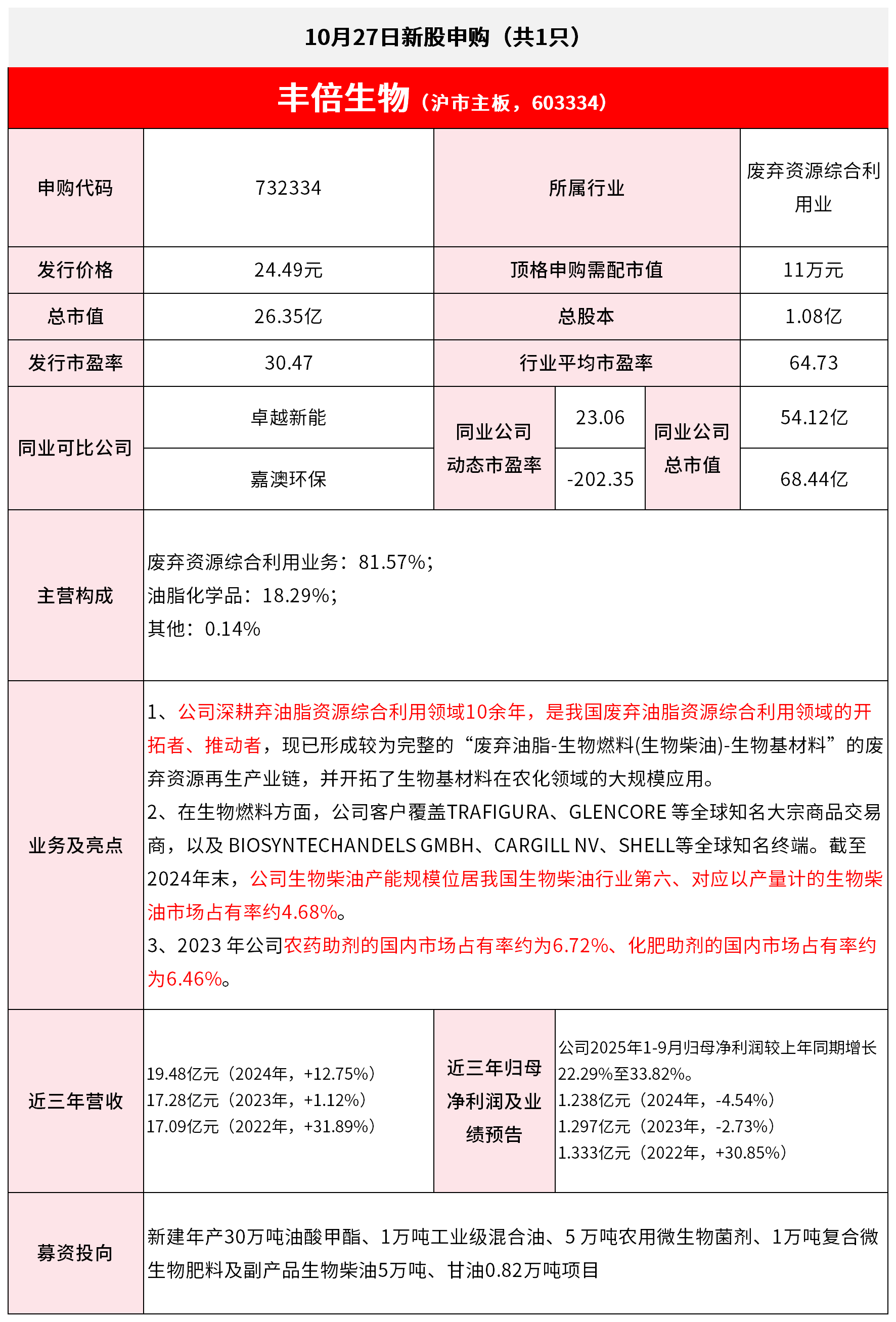 10月27日新股申购 (共1) | 丰倍生物(沪市主板,60 | | --- | | 申购代码 | 732334 | | --- | --- | | 发行价格 | 24.49元 顶格 | | 总市值 | 26.35亿 | | 发行市盈率 | 30.47 行业 | | 同业可比公司 | 卓越新能 同业公司 | | | 动态市盈率 嘉澳环保 | | | 废弃资源综合利用业务: 81.57%; | | 主营构成 | 油脂化学品: 18.29%; | | | 其他: 0.14% | | | 1、公司深耕弃油脂资源综合利用领域10余年,是 | | | 拓者、推动者,现已形成较为完整的"废弃油脂- | | | 弃资源再生产业链,并开拓了生物基材料在农化 | | | 2、在生物燃料方面,公司客户覆盖TRAFIGURA、 | | --- | --- | | 业务及亮点 | 商,以及 BIOSYNTECHANDELS GMBH、CARGII | | | 2024年末,公司生物柴油产能规模位居我国生物 | | | 油市场占有率约4.68%。 | | | 3、2023年公司农药助剂的国内市场占有率约为 | | | 为6.46%。 ...