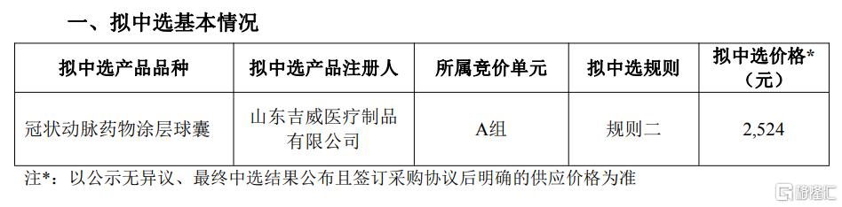 公司事件 - 蓝帆医疗控股子公司山东吉威医疗制品有限公司参加国家组织冠状动脉药物涂层球囊集中带量采购申报,产品拟中选 [1] - 拟中选产品为冠状动脉药物涂层球囊,所属竞价单元为A组,拟中选价格为2524元 [1] - 本次集采周期至2028年12月31日 [1] - 最终中选结果尚未公布,采购协议尚未签订,对业绩影响存在不确定性 [1] 潜在影响 - 若后续签订采购协议并执行,将提升公司药涂球囊产品的市场影响力 [1]