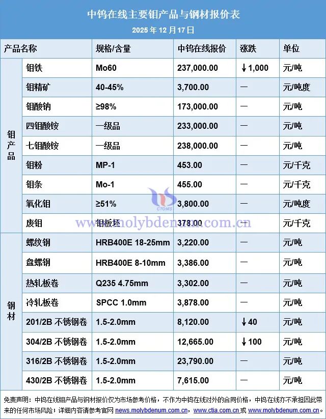2025年12月15日钼价和钢价一览 | | | 中钙在线主要钥产品与钢材报价表 | | | | | --- | --- | --- | --- | --- | --- | | | | 2025年12月15日 | | | | | 产品名称 | | 规格/含量 | 中钨在线报价 | 涨跌 | 車位 | | | 領鉄 | Mo60 | 240,000.00 | - | 元/吨 | | | 領精矿 | 40-45% | 3,700.00 | ↓ 20 | 元/吨度 | | | 領数納 | ≥98% | 173,000.00 | - | 兀陣 | | 书 | 四钼酸铵 | 级品 | 233,000.00 | - | 元/吨 | | Iz | 七钥酸铵 | 级品 | 238,000.00 | - | 元/吨 | | | 相粉 | MP-1 | 453.00 | - | 元/千克 | | | 错条 | Mo-1 | 455.00 | - | 元/千克 | | | 氧化钼 | ≥51% | 3,800.00 | ↓ 20 | 元/吨度 | | | 废卸 WW | 铝板坯 who | 378.00 | | 元/千克 | | ...