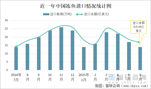 2025年6月中国冻鱼进口数量和进口金额分别为14万吨和3.34亿美元